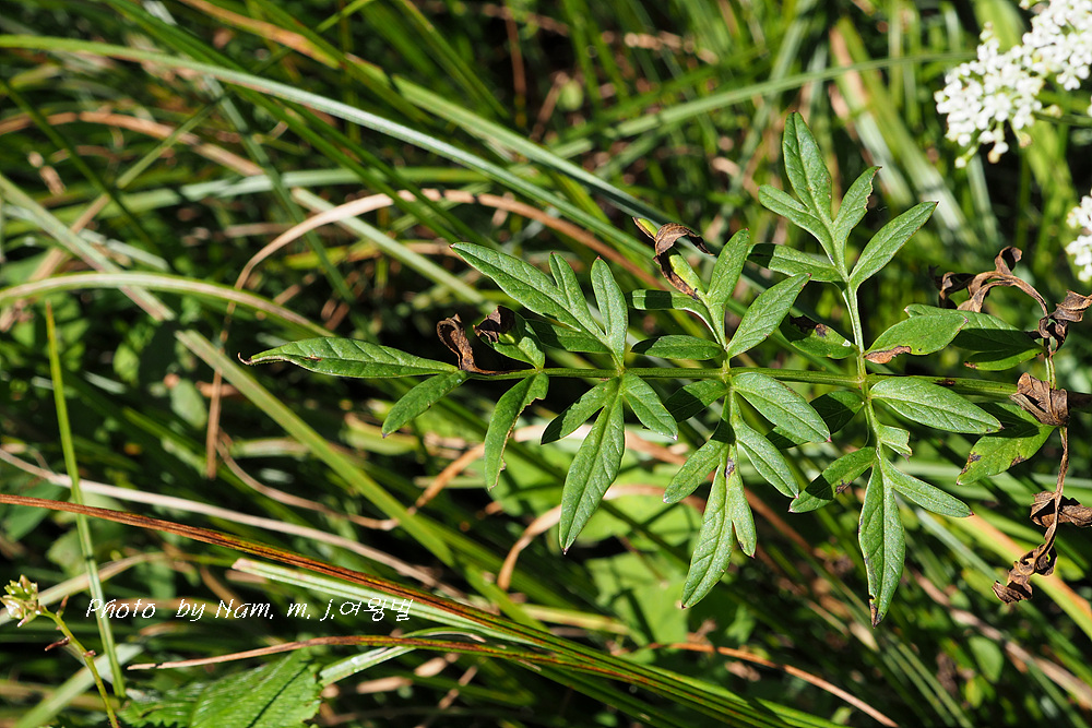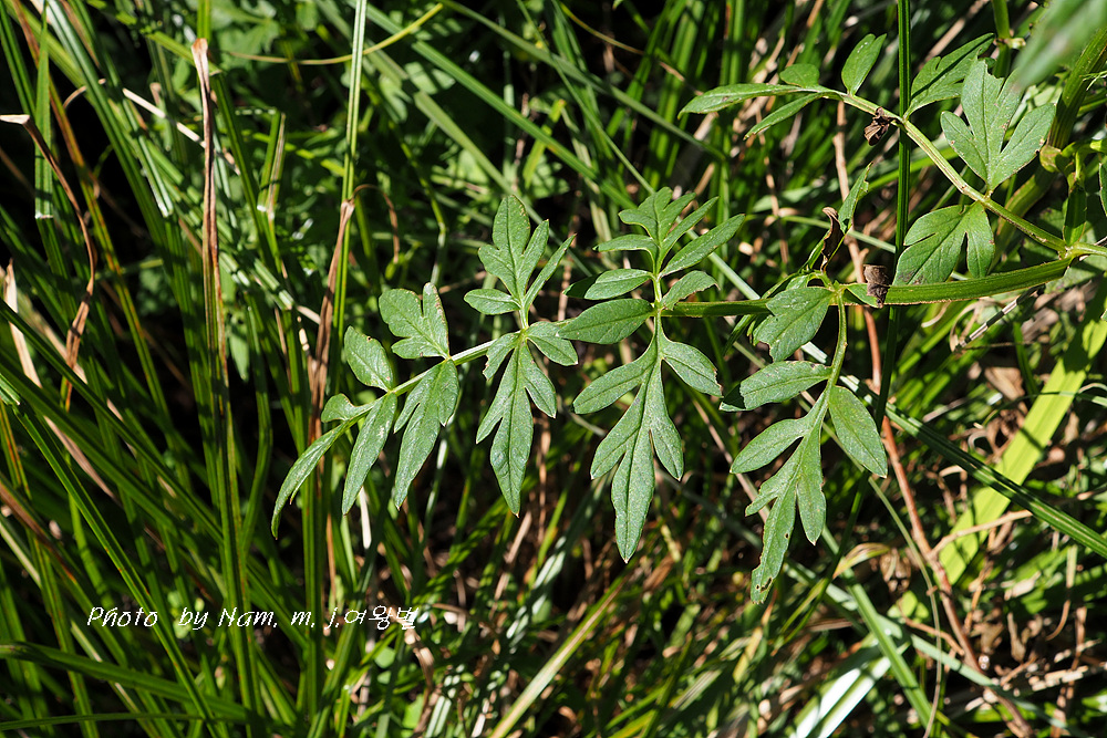 잎이 2~4회 3출 또는 우상복엽으로 가늘게 갈라져서 열편이 선형에서 피침형이고 가장자리고 매끈하다.