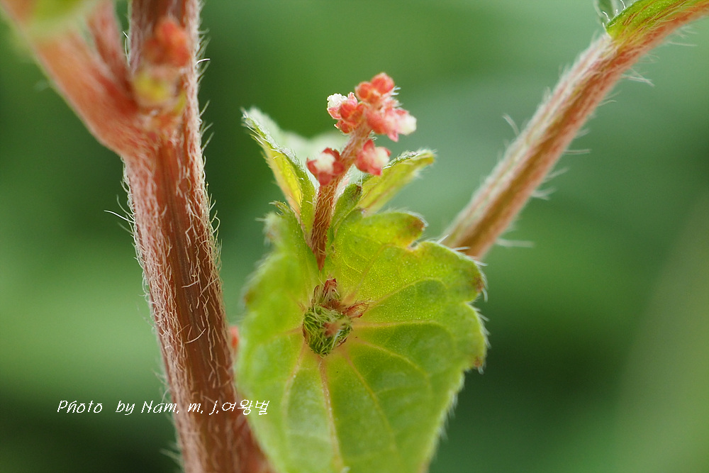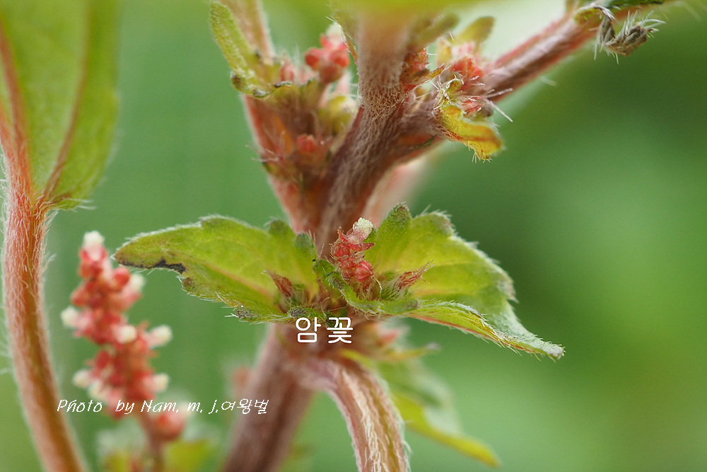 위쪽이 수꽃, 아래쪽 삼각상 고깔같은 포에 싸여 있는 게 암꽃이다.