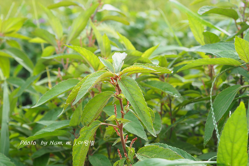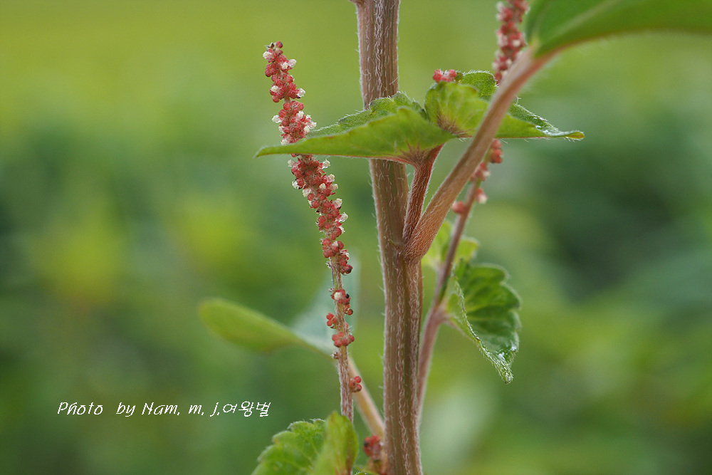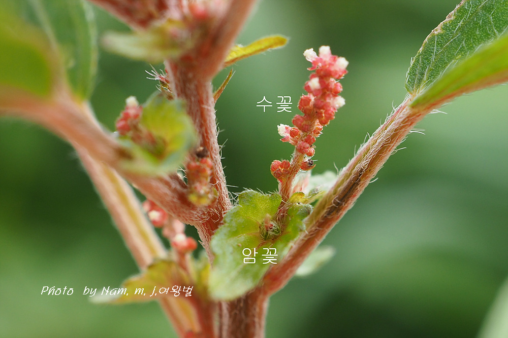 위쪽 이삭꽃차례에 붙어 있는 녀석이 수꽃이다.