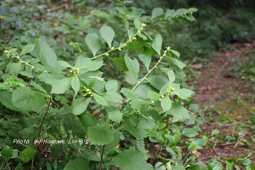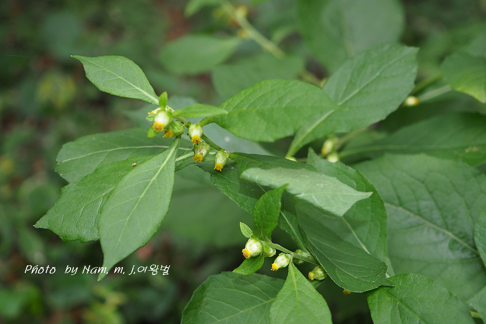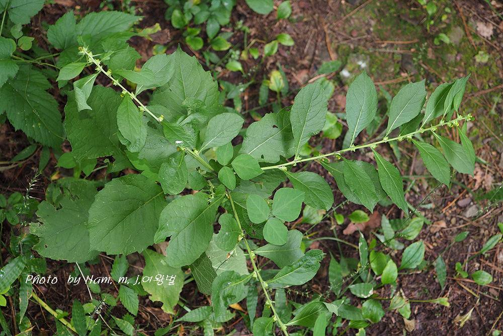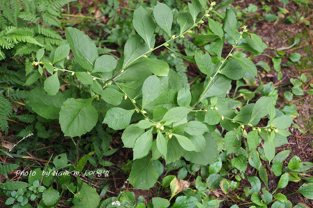 이 녀석은 꽃자루가 거의 없는 작은 꽃들이 이삭꽃차례처럼 잎겨드랑이에 다닥다닥 붙어 있다.