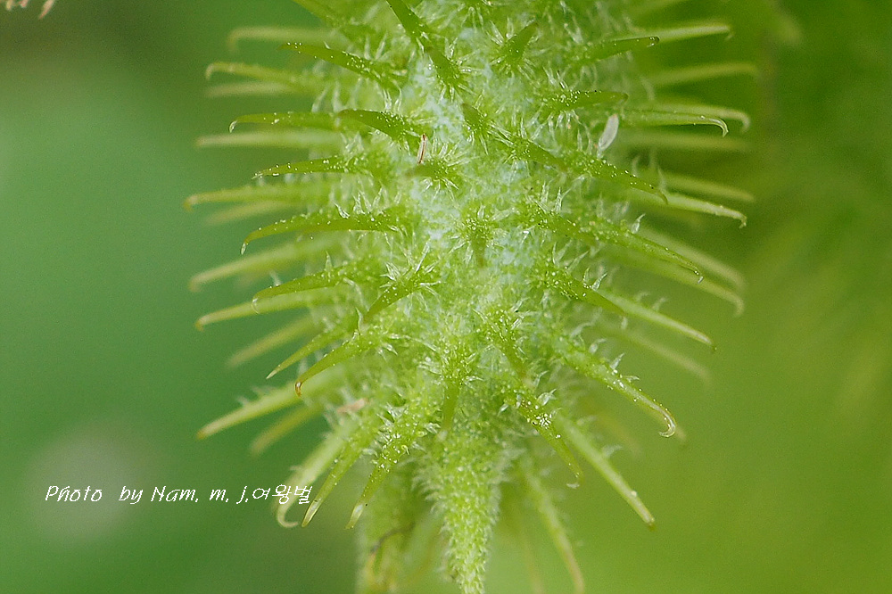 열매 겉에 끝이 고부라진 가시돌기가 있고 그 돌기 기부에는 인편의 가시털이 있다.
