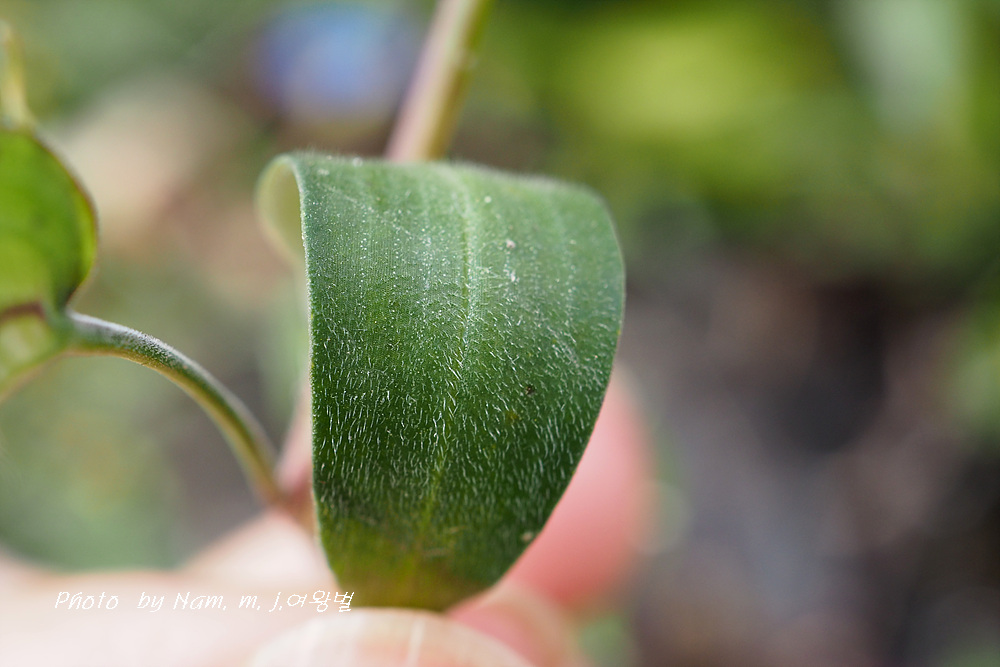 잎집 위에 연한 털이 있다. 포엽은 넓은 심장형으로 안으로 접히고 길이 약 2cm, 겉에 흰 털이 있다