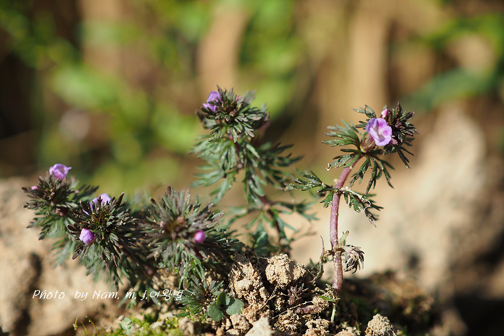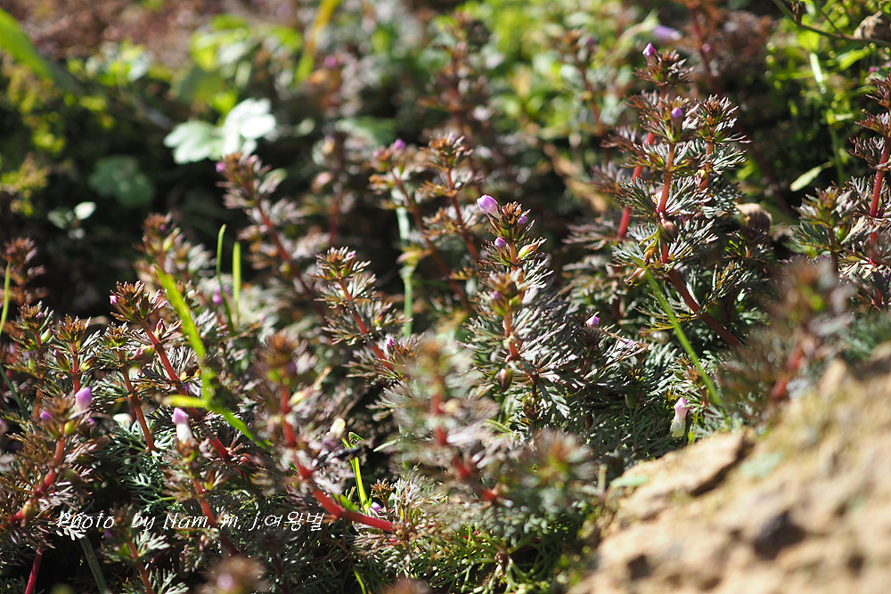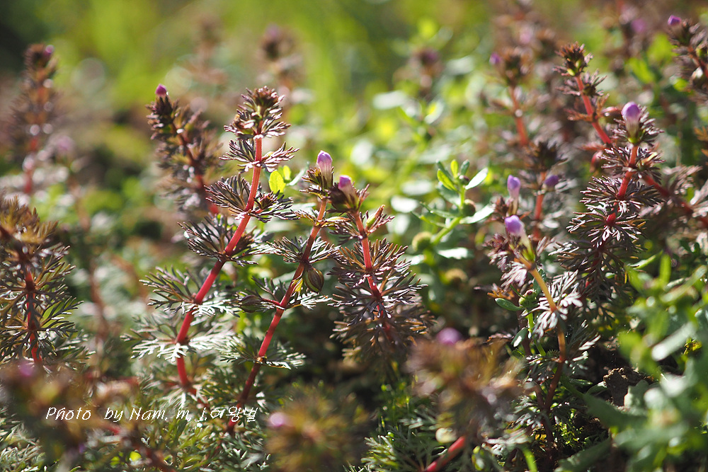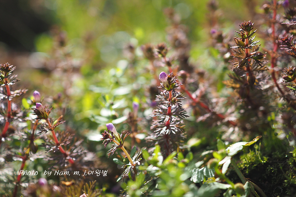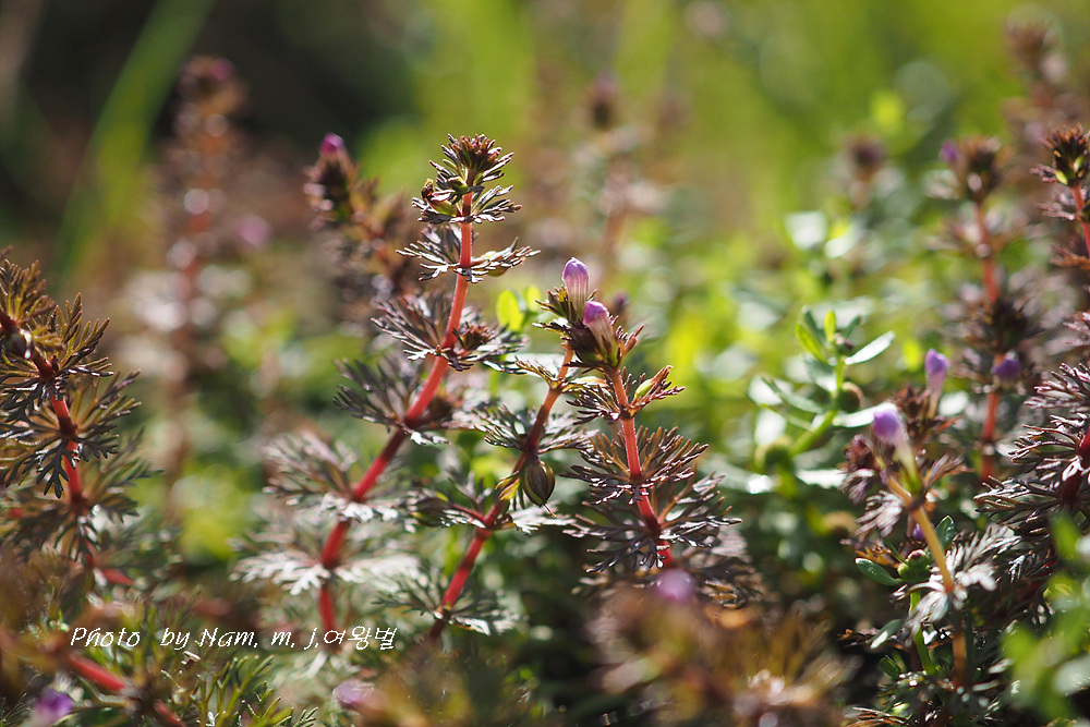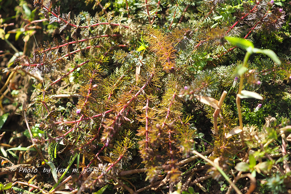 | 충청도와 경상남도의 습지에 자라는 여러해살이풀이다. 줄기는 가지가 많이 갈라지며, 길이 20-60cm쯤이다. 물 위의 잎은 5-6개가 돌려나고, 깃털 모양으로 갈라지며, 길이 1.0-1.5cm, 폭 3-5mm로서 밑부분이 좁아져 직접 줄기에 붙고, 물속의 잎은 바늘 모양으로 깊게 갈라진다. 꽃은 9-10월에 피고, 잎겨드랑이에 1개씩 달리며, 작은 꽃자루는 털이 없고, 길이가 꽃받침보다 짧거나 비슷하며, 흰색, 붉은색 또는 보라색이다. 꽃받침은 길이 3.0-3.5mm, 5갈래로 깊게 갈라진다. 꽃부리는 입술 모양이다. 구와말과 비슷하나 줄기에 털이 없으므로 구분된다. |