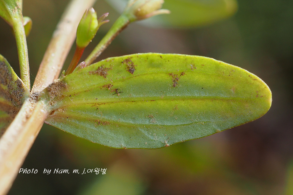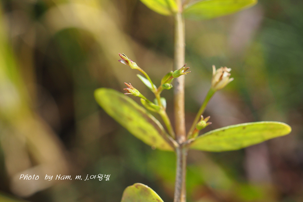 잎이 마주나며 타원형으로 끝은 둔하고 가장자리는 밋밋하다.