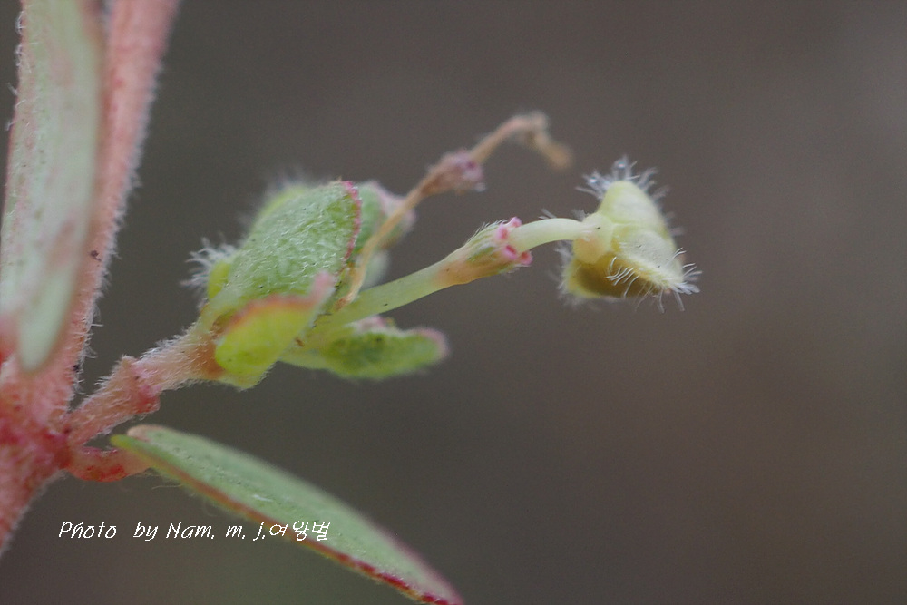 줄기와 타원형의 잎 뒷면에 털이 많고 열매 능선에 털이 있다.