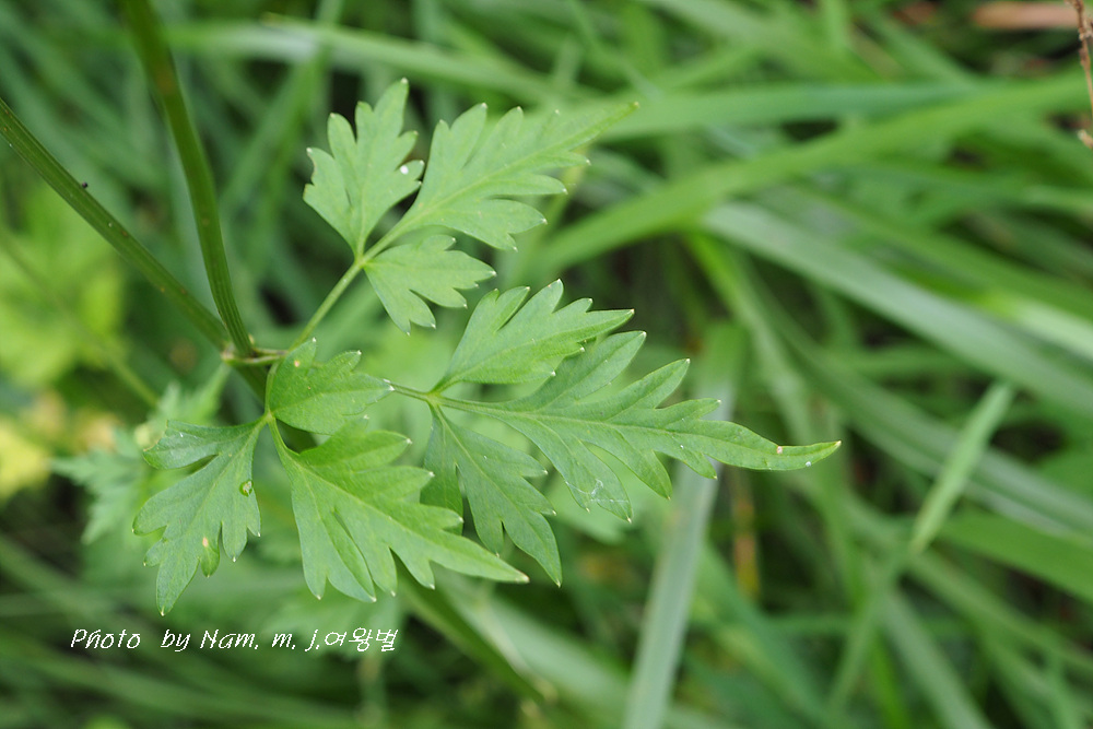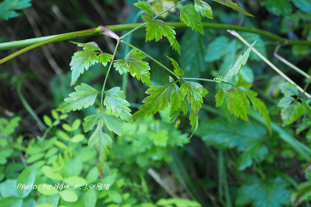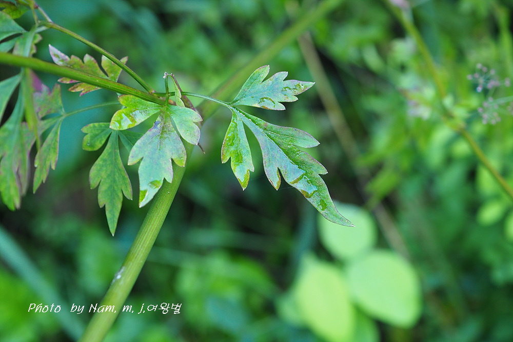 잎몸은 넓은 삼각상 난형으로 2~3회 깃 모양으로 갈라지고, 첫 번째와 두 번째 갈래잎은 자루가 있다.