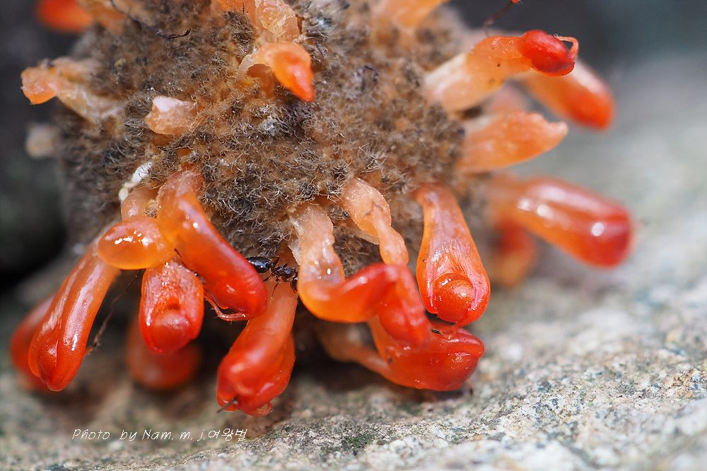 열매에 붉은 촉수를 내민 듯 구불거리는 모습이 좀 징그러운 느낌이다.
