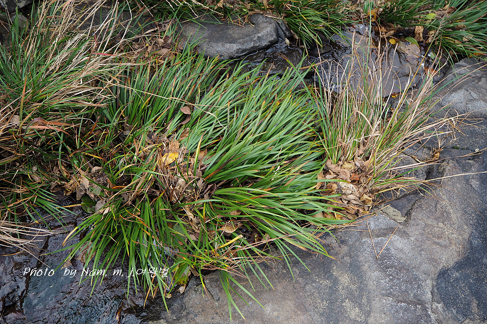 잎은 모여나며, 선형으로 끝은 뾰족하고, 가운데 잎맥은 뚜렷하지 않다.