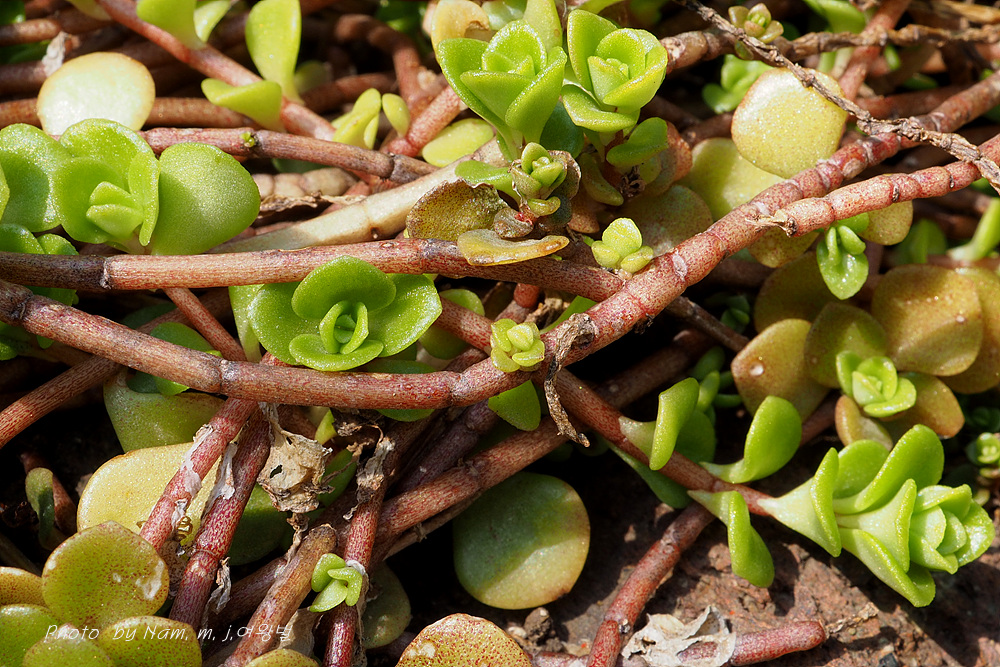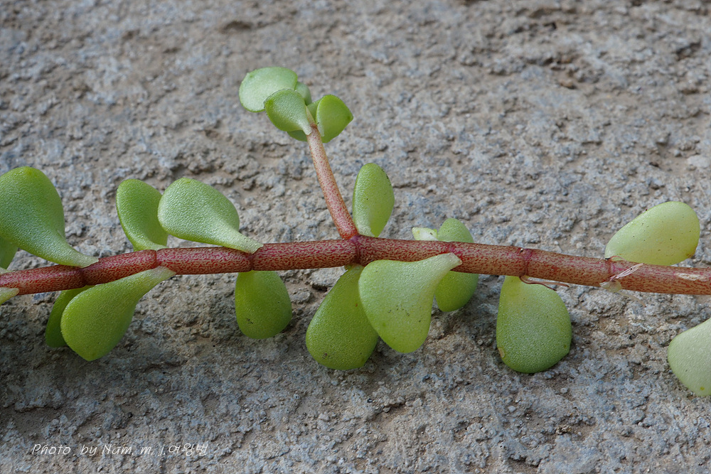 줄기 아래쪽은 땅을 기며, 마디에서 뿌리가 나오고 위쪽은 곧게 자란다. 잎은 넓고 납작한 다육질로 끝은 둥글다