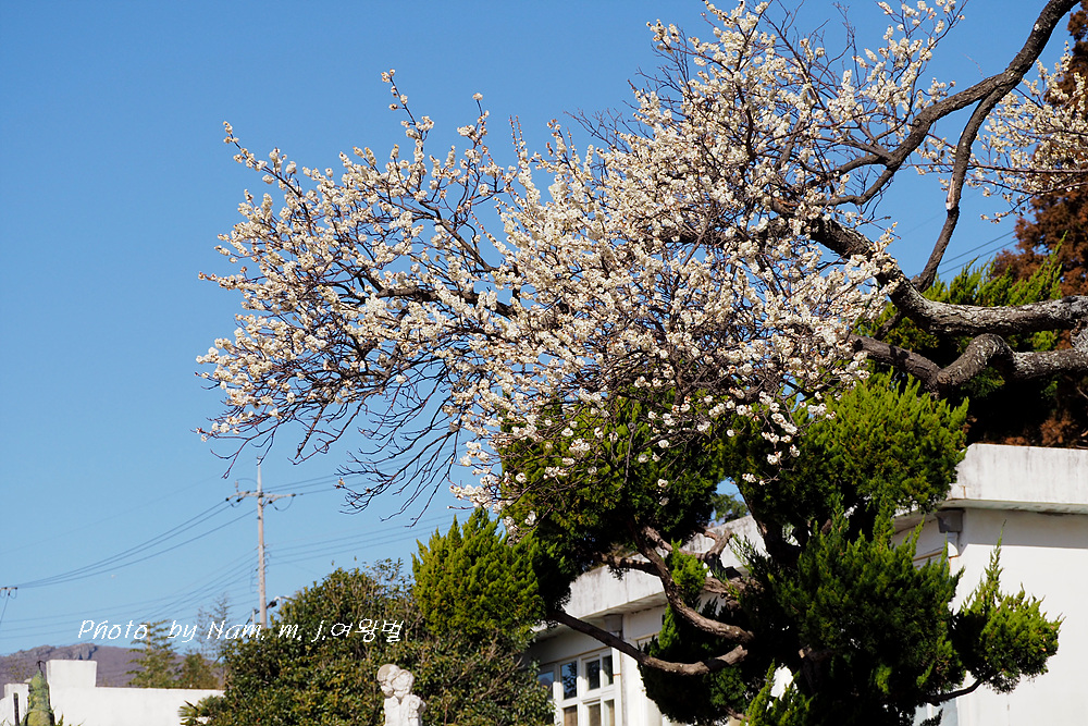 폐교된 구조라초등학교 울타리 축대 위의 고목 매실나무에 꽃이 화사하게 피었다.