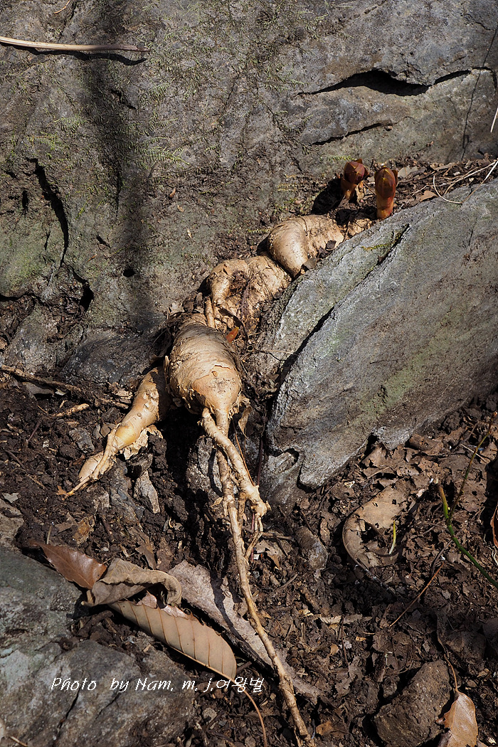 도라지 뿌리 같은 뿌리가 거의 밖으로 다 드러나 있는 채로도 싹을 올리고 있다.