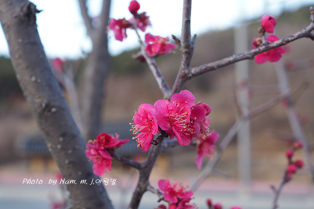 도로변에 조경수로 심어 둔 붉은 홍매실이 일찍도 꽃을 피웠다.