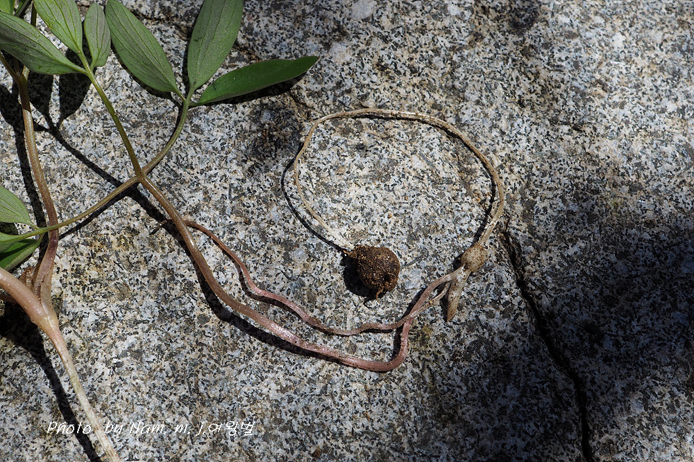 뿌리는 둥근 괴경이고 줄기 인편엽 아래에 흰색의 둥근 부속체가 달려 있다.