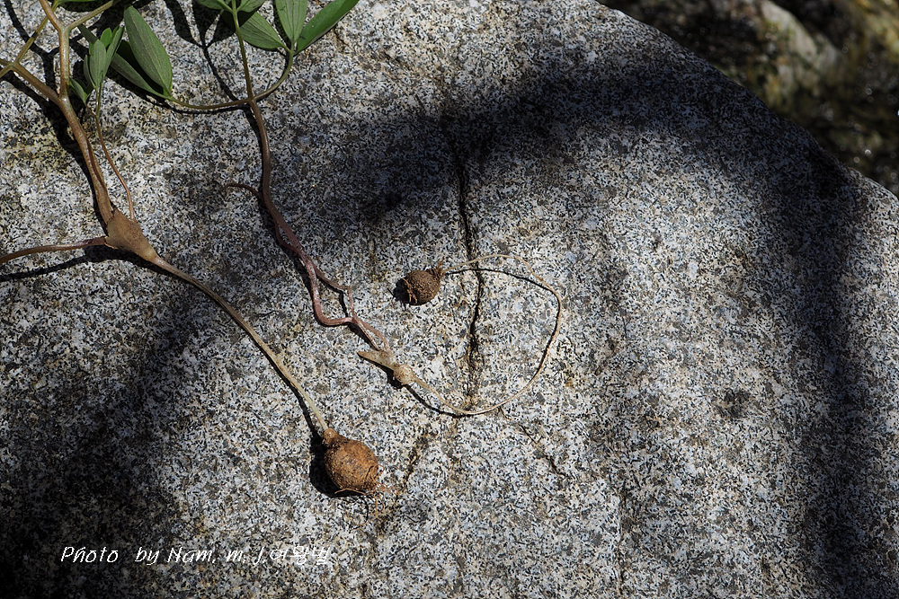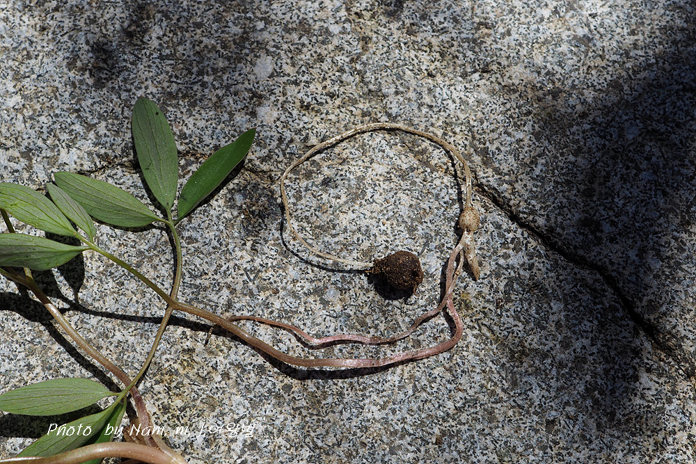 꽃을 피우지 않은 어린 개체는 괴경 모양의 부속체가 인편엽 아래에 달려 있었다.