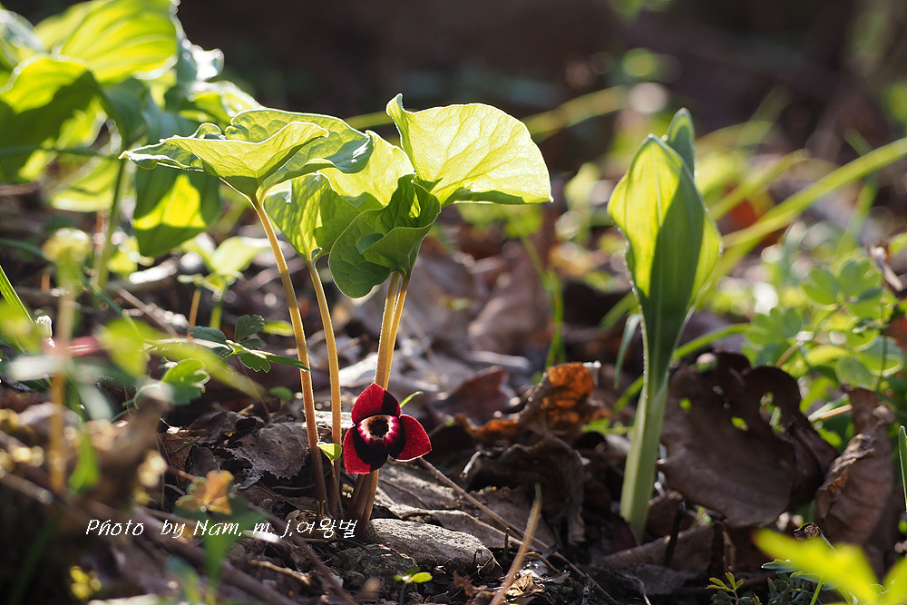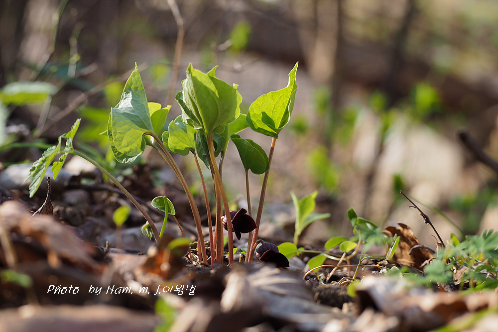 잎이 돋아날 때 어두우 자색을 띠며 꽃의 색도 짙은 자색이다.