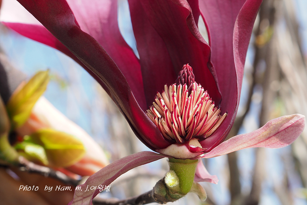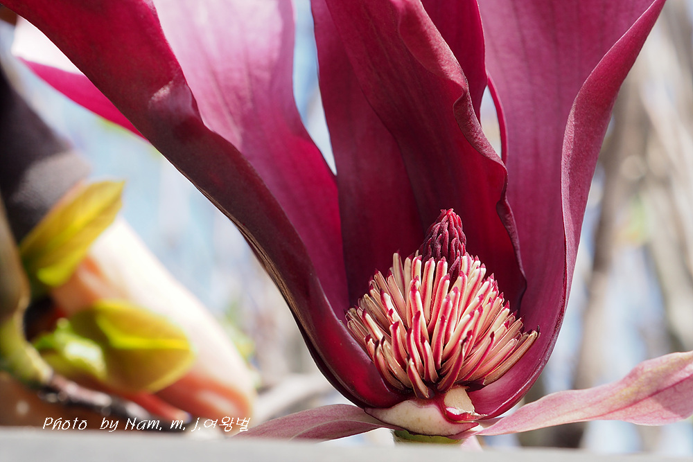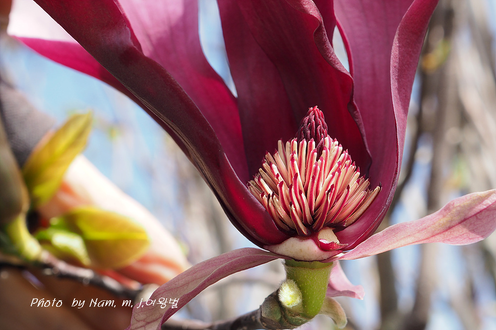 자목련은 꽃잎 겉은 진한 자주색이고, 안쪽은 연한 자주색이다.