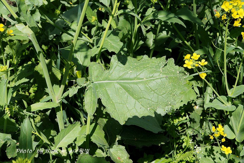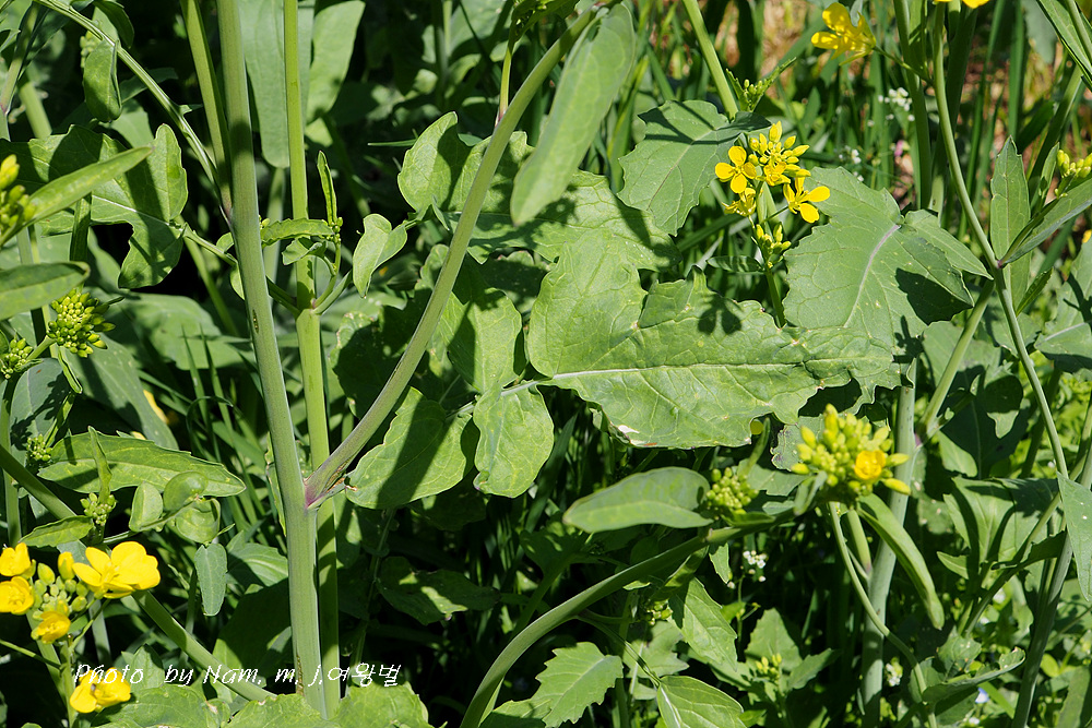 들갓과 달리 전초에 털이 없고 잎기부가 줄기를 감싸는 유채에 비하여 잎자루가 있다.