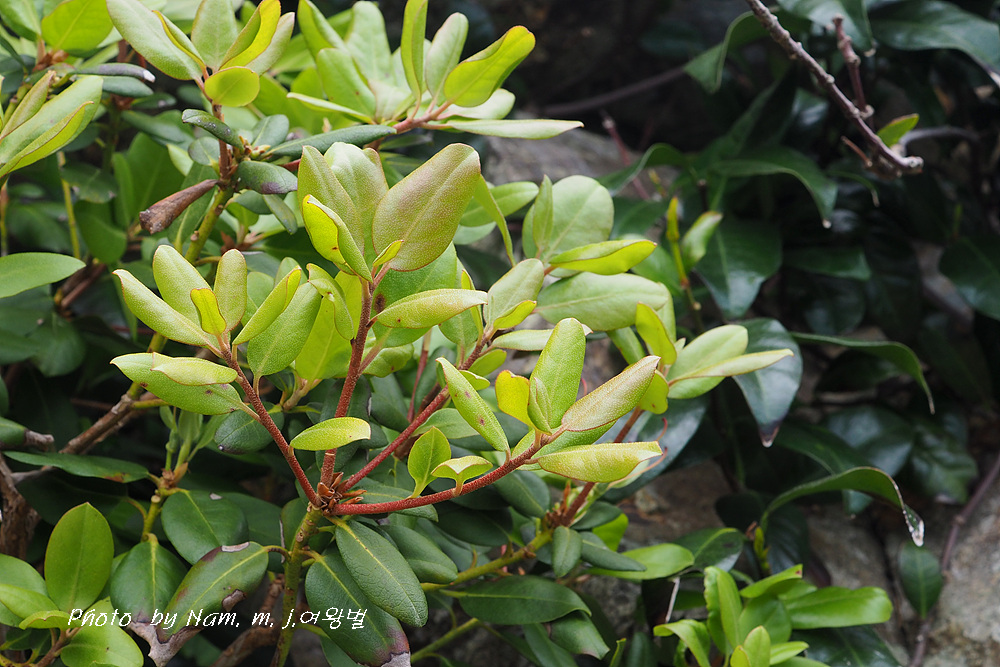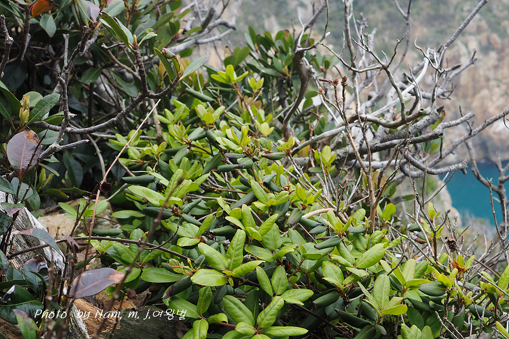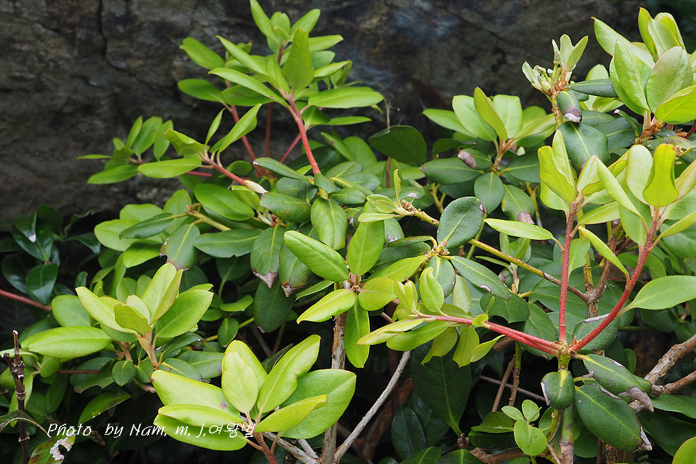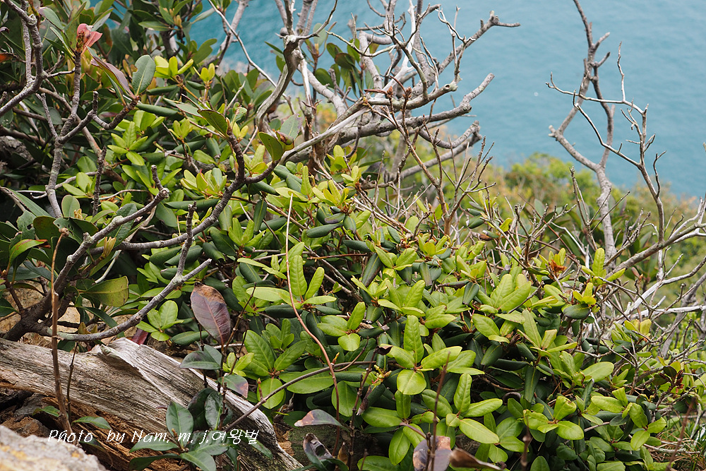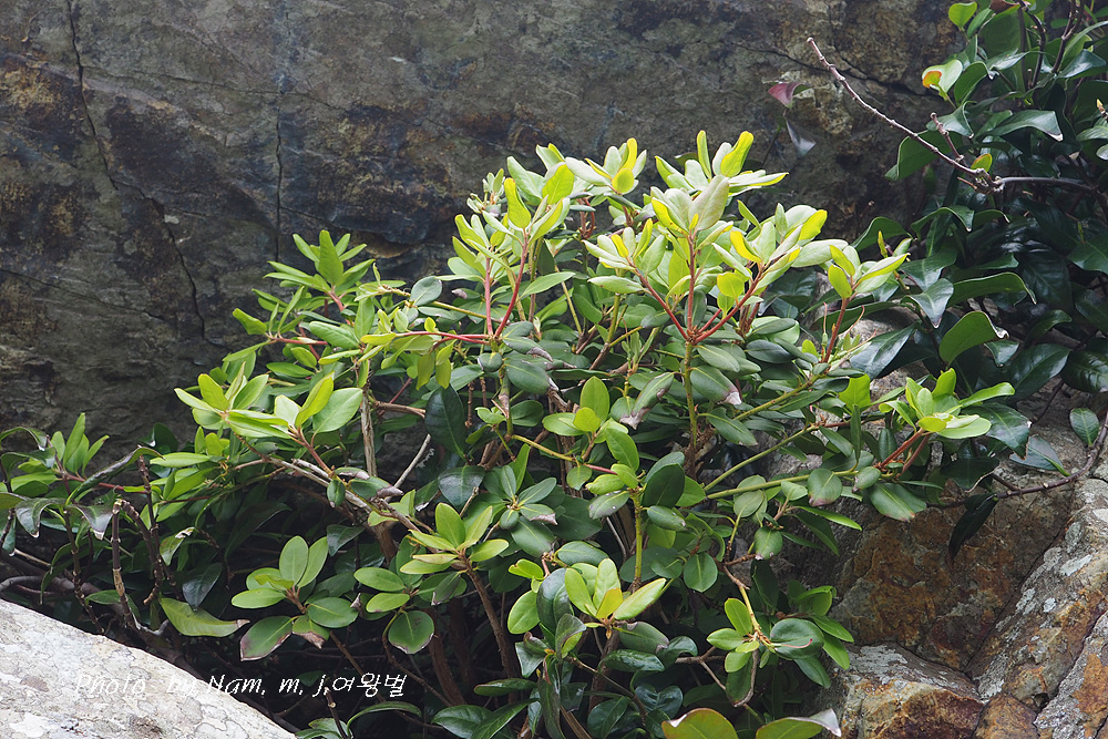 절벽 바위벽에 붙어서 낮게 자라고 있었는데 잎의 모양은 만병초잎과 비슷하였다.