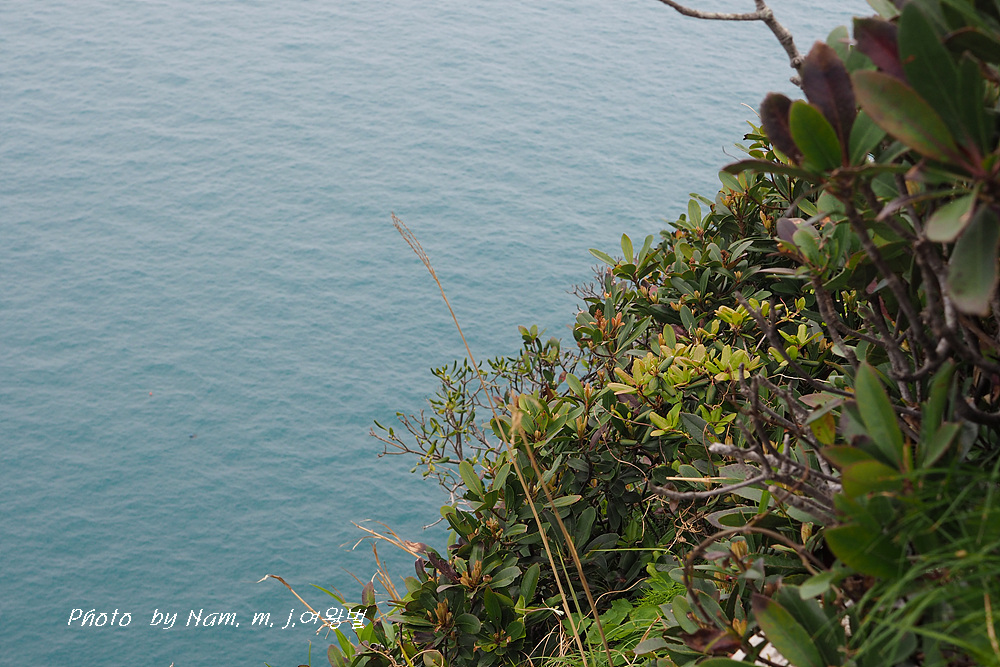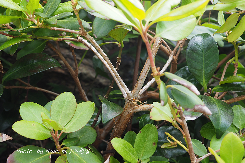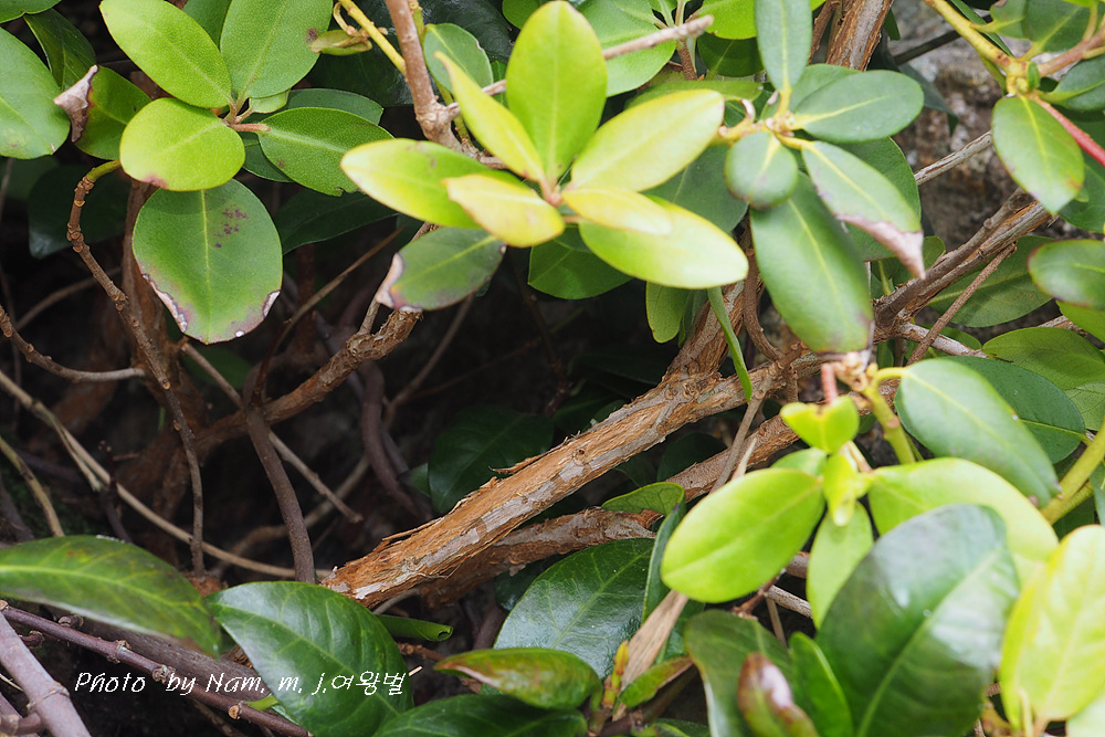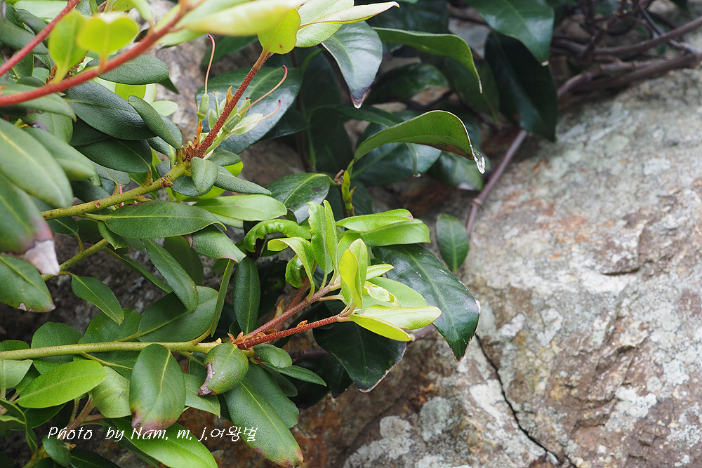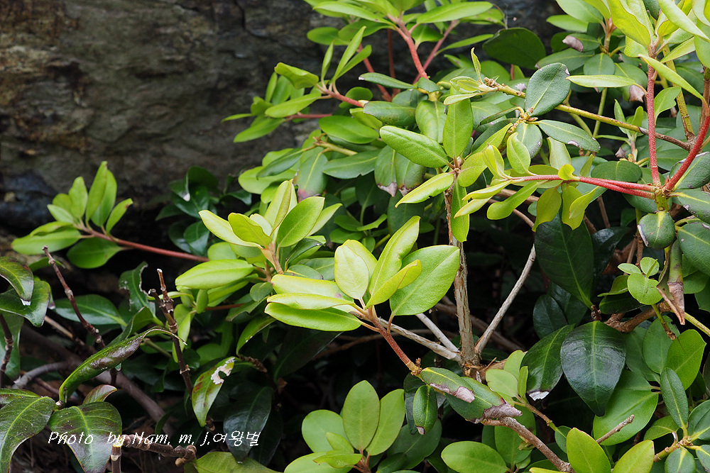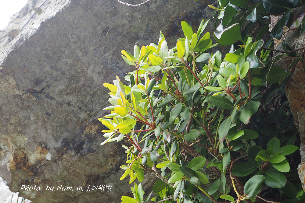 절벽 바위벽에 붙어서 낮게 자라고 있었는데 잎의 모양은 만병초잎과 비슷하였다.