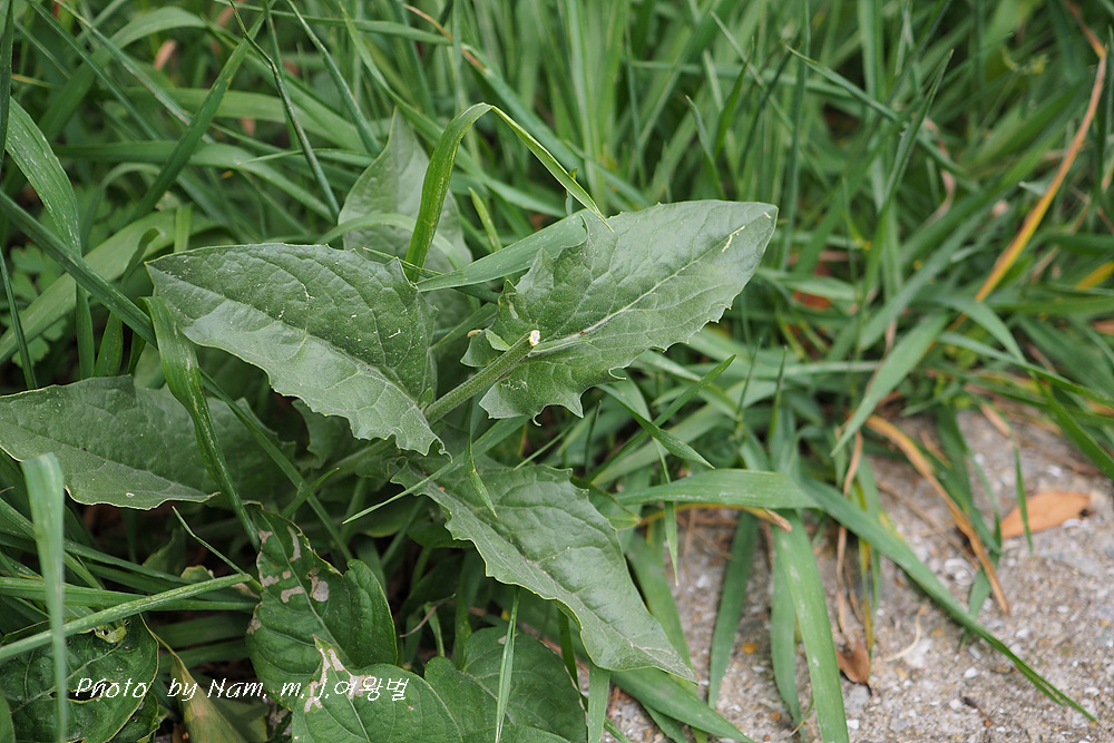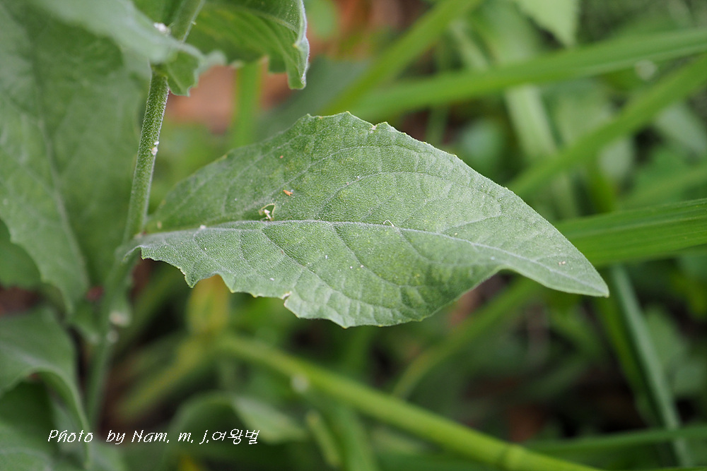 아래쪽 잎은 잎자루가 있고, 위쪽 잎은 잎자루가 없으며 밑부분이 줄기를 둘러싼다