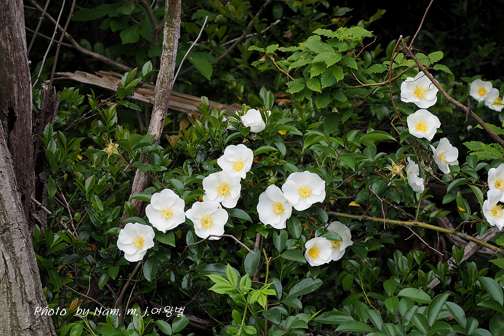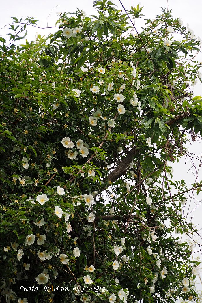 꽃은 장미꽃 크기만한 찔레꽃 모양이 홑꽃으로 햇가지 끝에 한 개씩 달리며