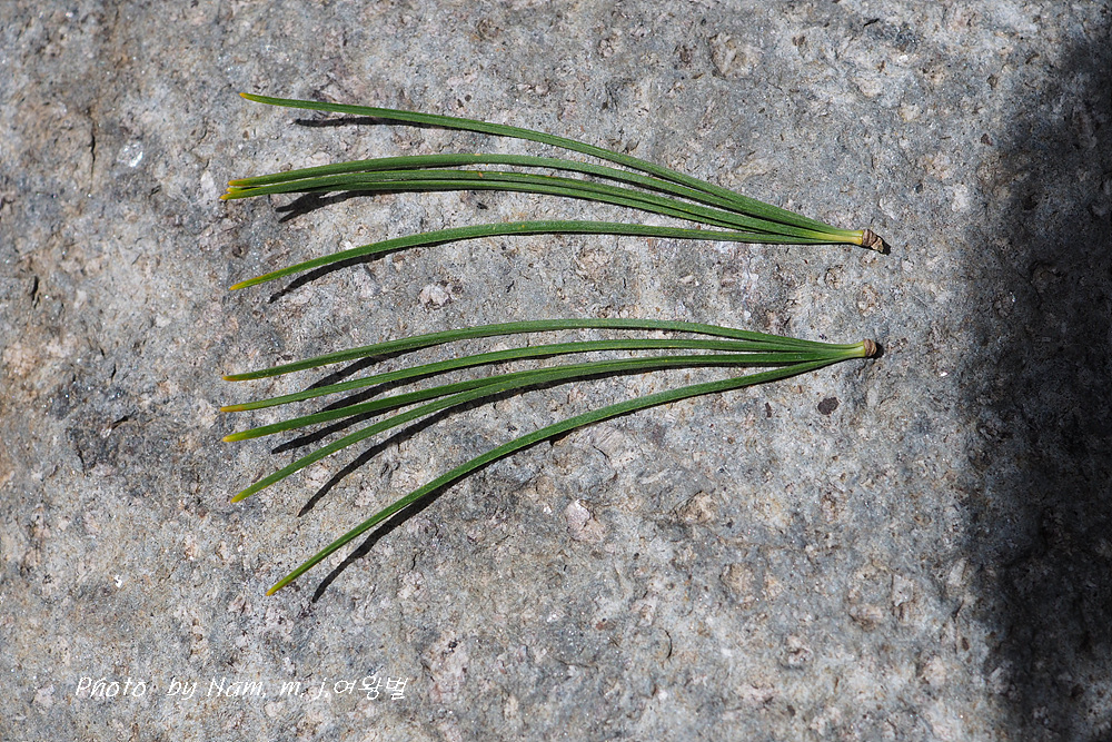 잎은 단지에 5개가 모여나며 길이 3~8cm이고 뒷면에 2줄의 흰색 기공선이 있다.