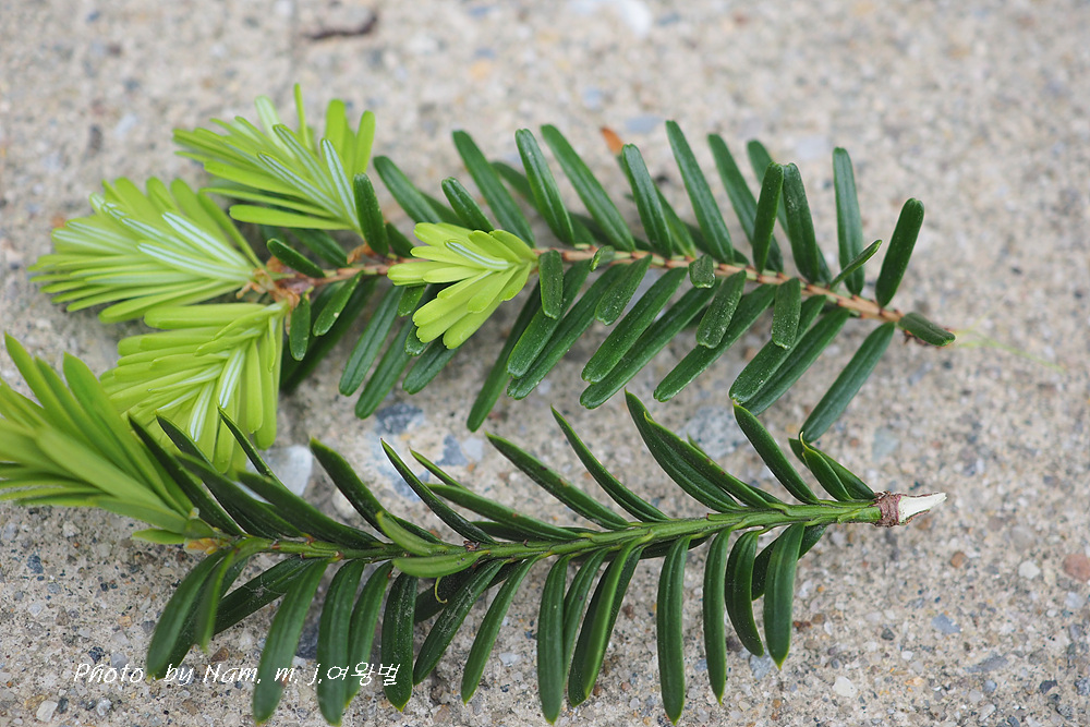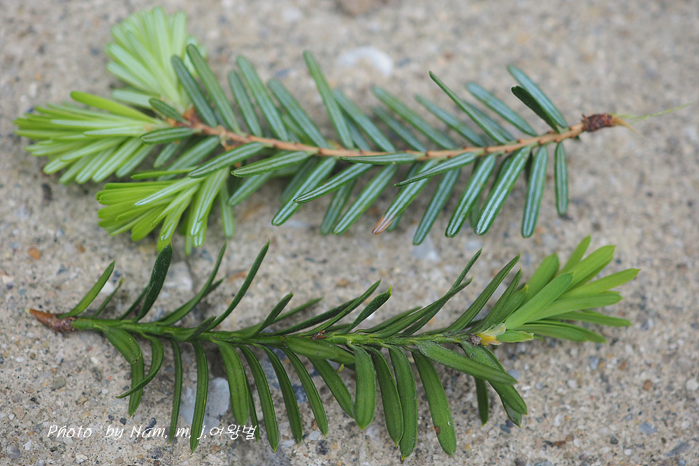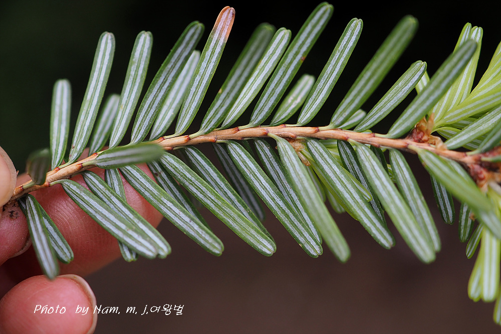 잎은 선형이고 길이 1~2cm로 표면은 윤기가 있는 짙은 녹색이고, 뒷면에 2줄의 흰색 기공선이 있다.