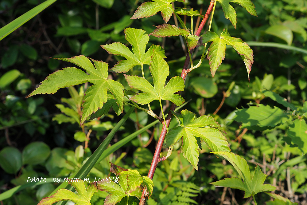 단풍잎처럼 장상으로 깊게 갈라진 잎과 분백색 가루를 덮어 쓰고 있는 햇순의 모습에서 국명을 얻었지만