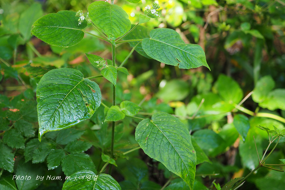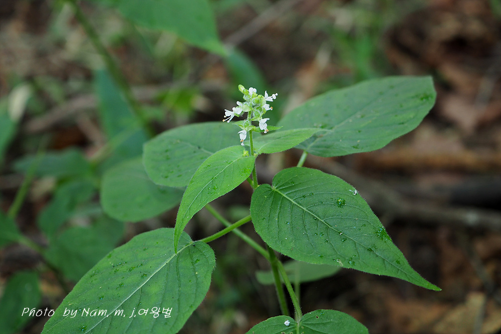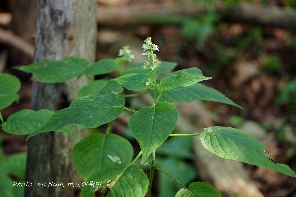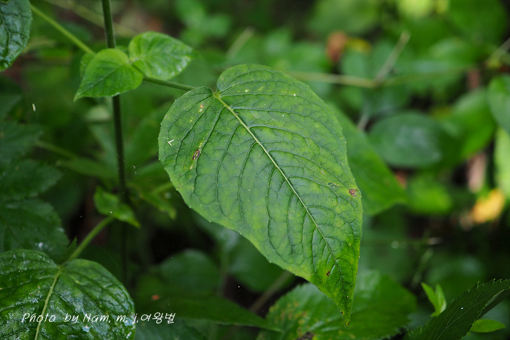 잎몸은 난형 또는 넓은 난형으로 길 끝은 급하게 좁아져 뾰족해지고 밑은 둥글거나 얕은 심장형이다.