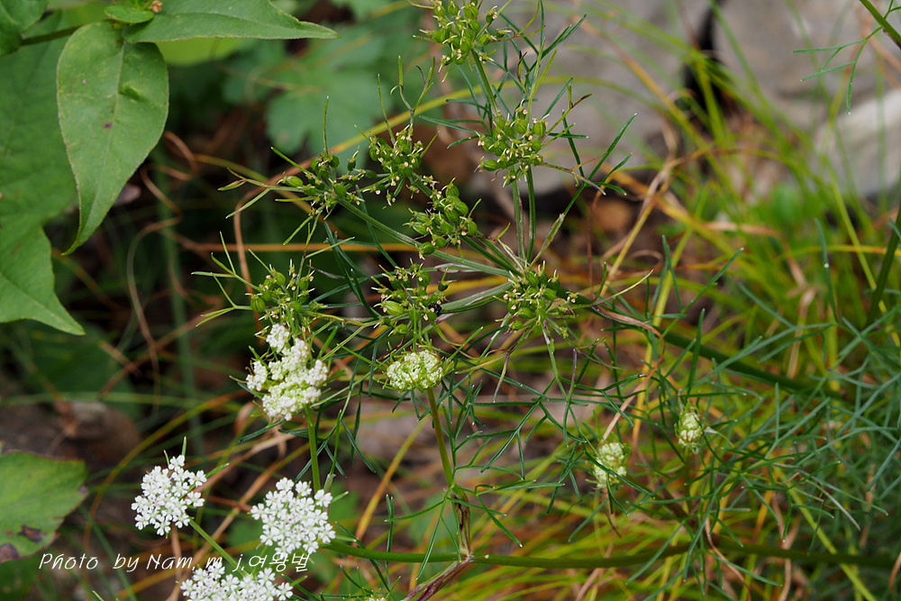 줄기잎은 어긋나며, 3~4회 갈라지는 깃꼴겹잎, 잎자루가 짧다. 잎의 마지막 갈래는 실 모양이다.