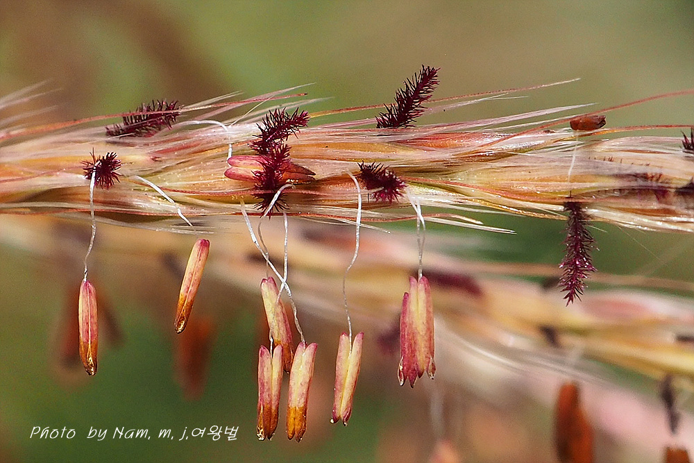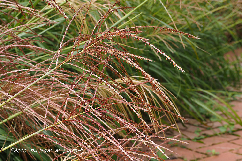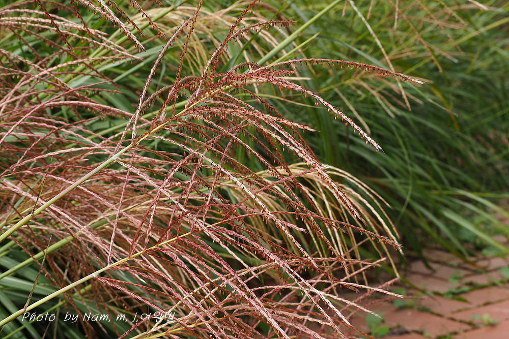 억새는 참억새(M. sinensis)에 비해 소수 기반의 털이 자주색이며 제1포영은 4맥이 있다.