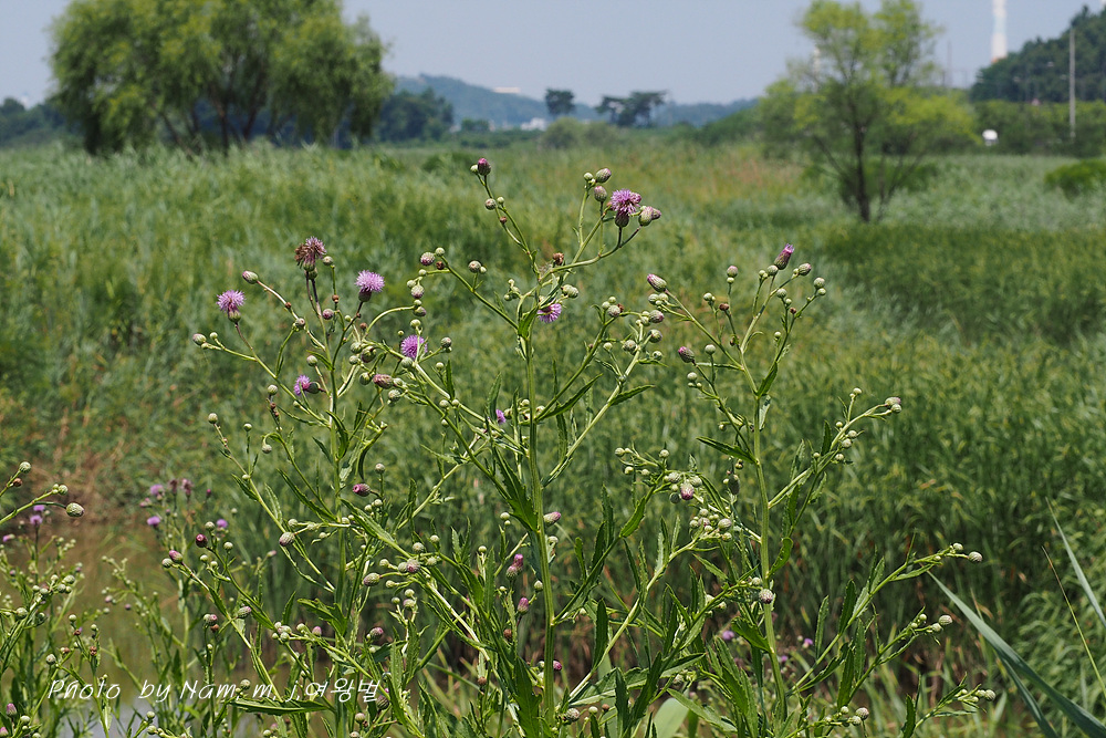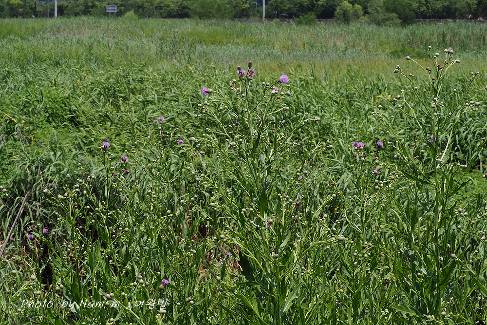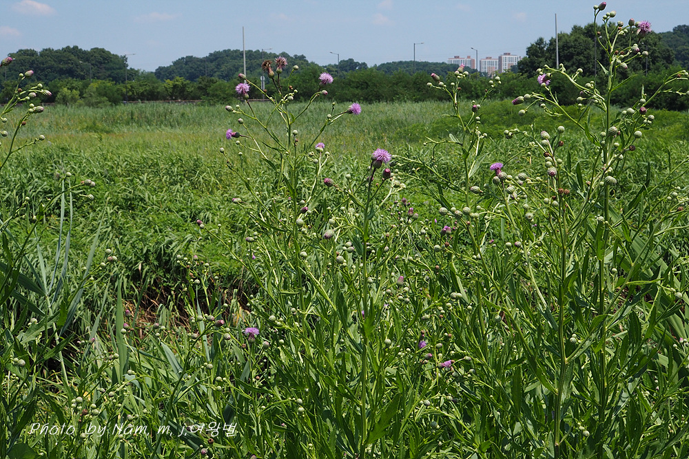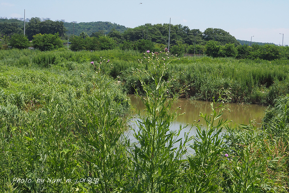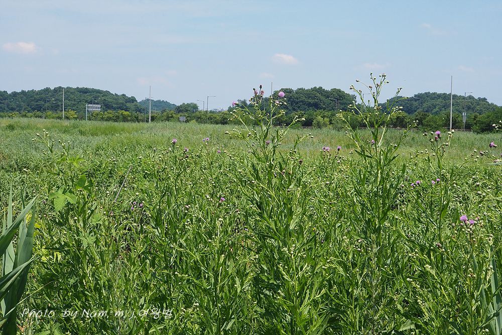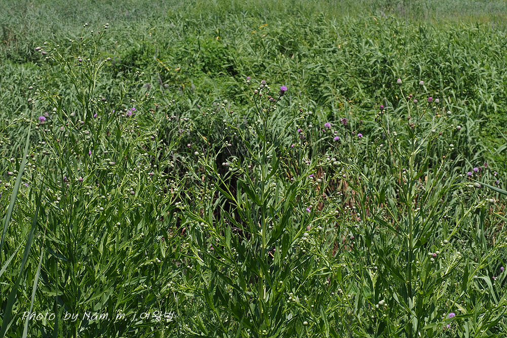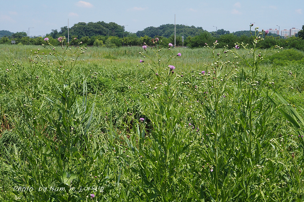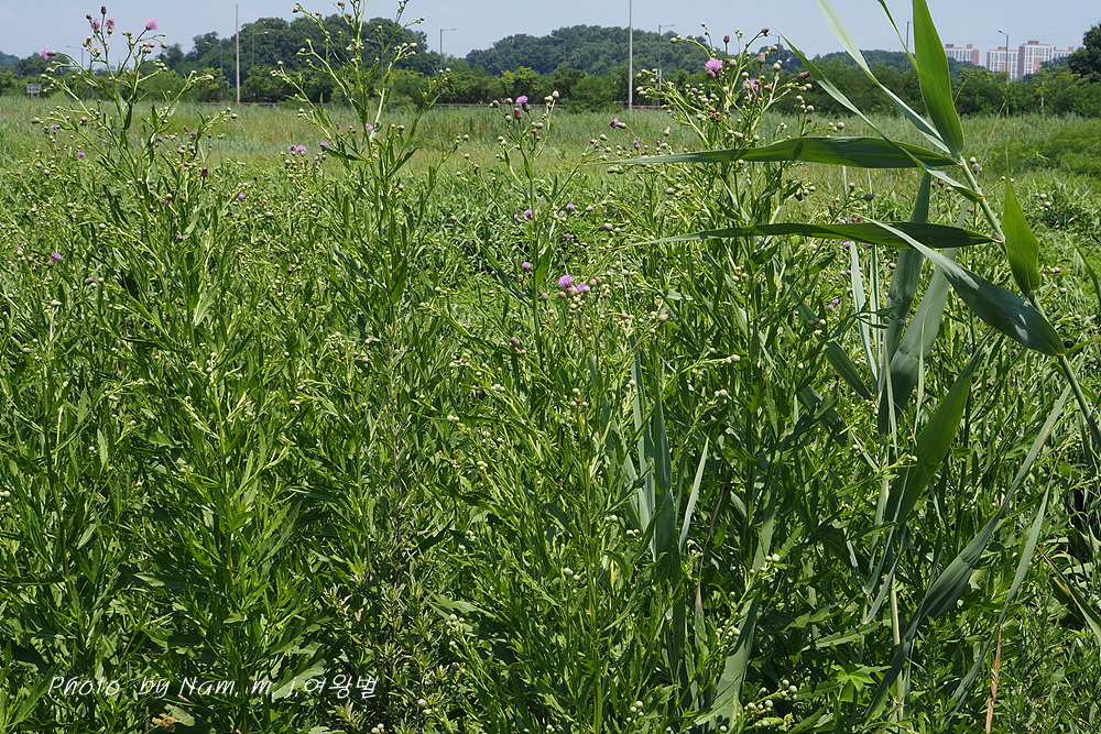 강 하구 하천 습지에 갈대가 가득하고 큰조뱅이도 한 식구로 넓게 자리를 차지하고 있다.