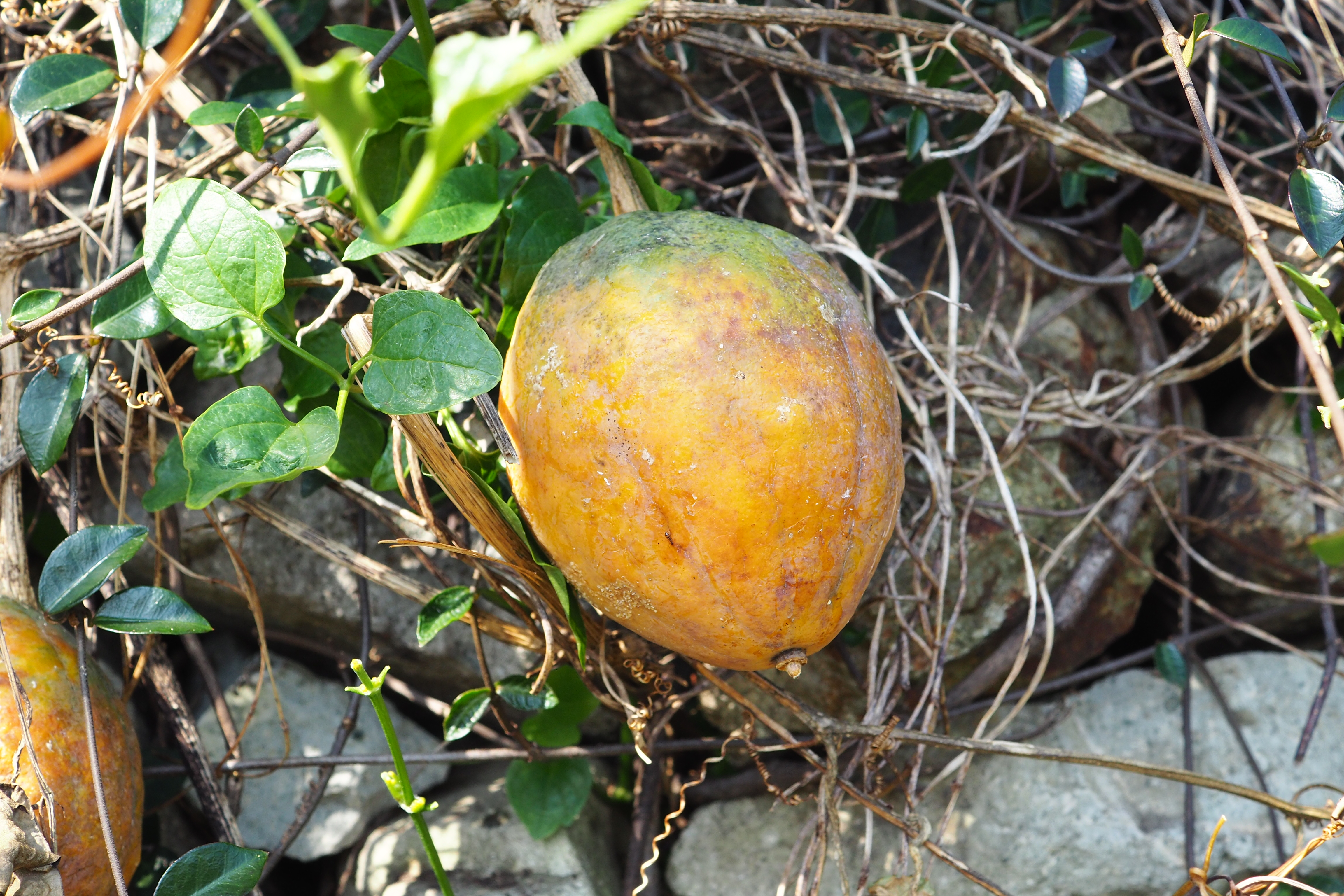 노랑하늘타리 열매는 하늘타리에 비하여 약간 길쭉한 타원형이다.
