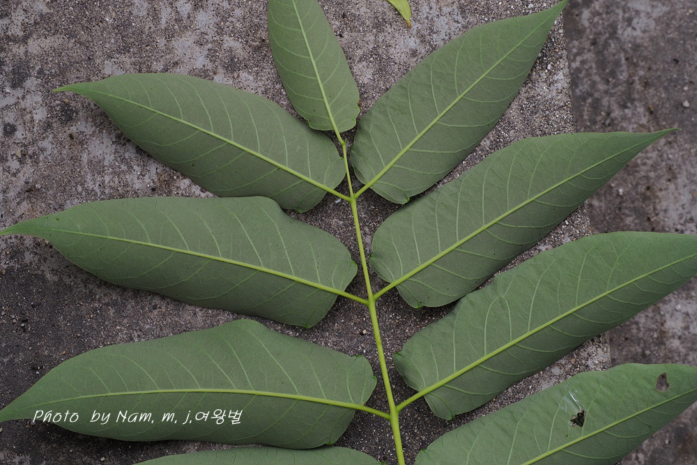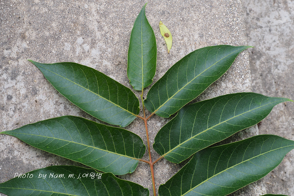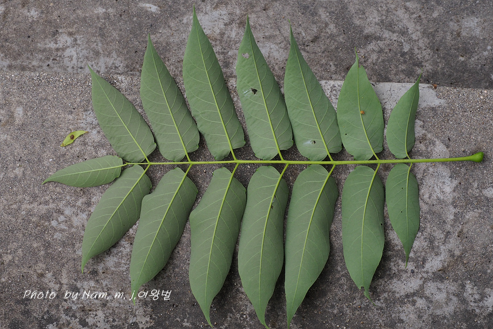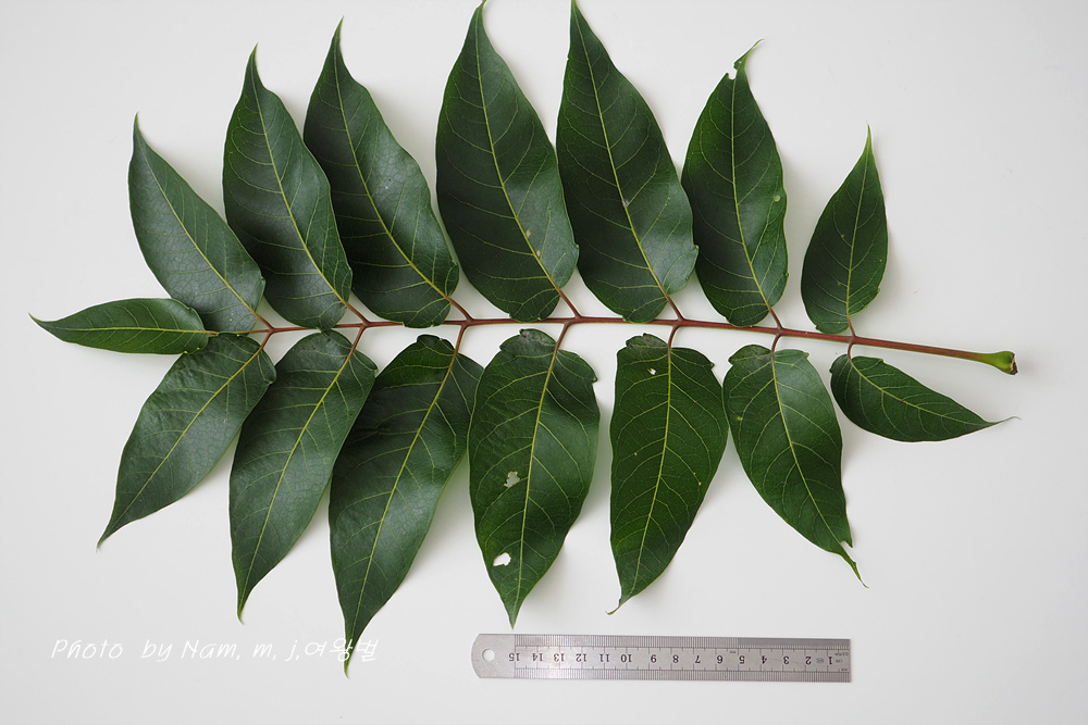 참죽나무와 달리 홀수깃꼴잎이고 소엽 수가 적으며 소엽 기부에 샘점이 있다.