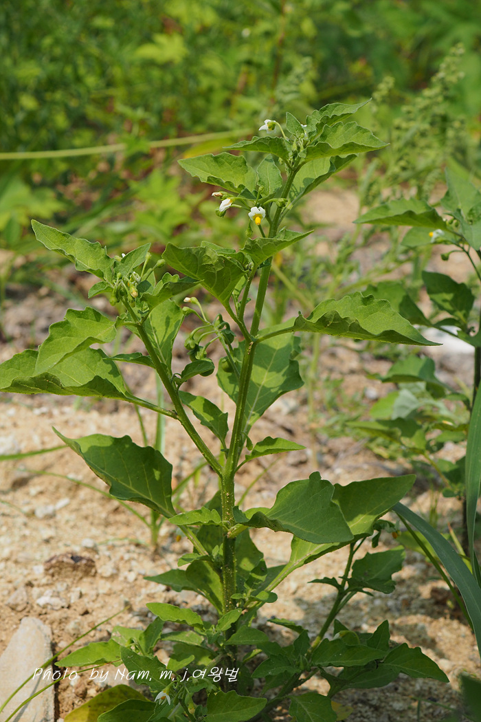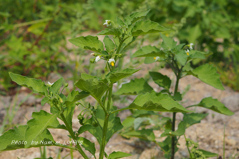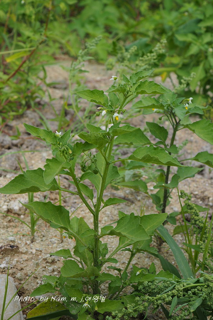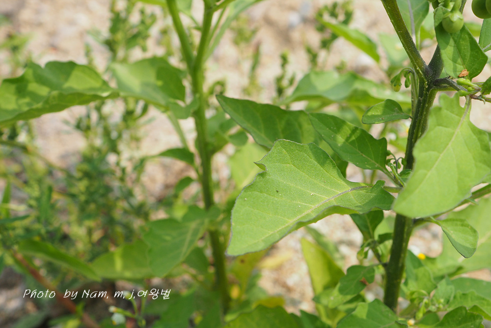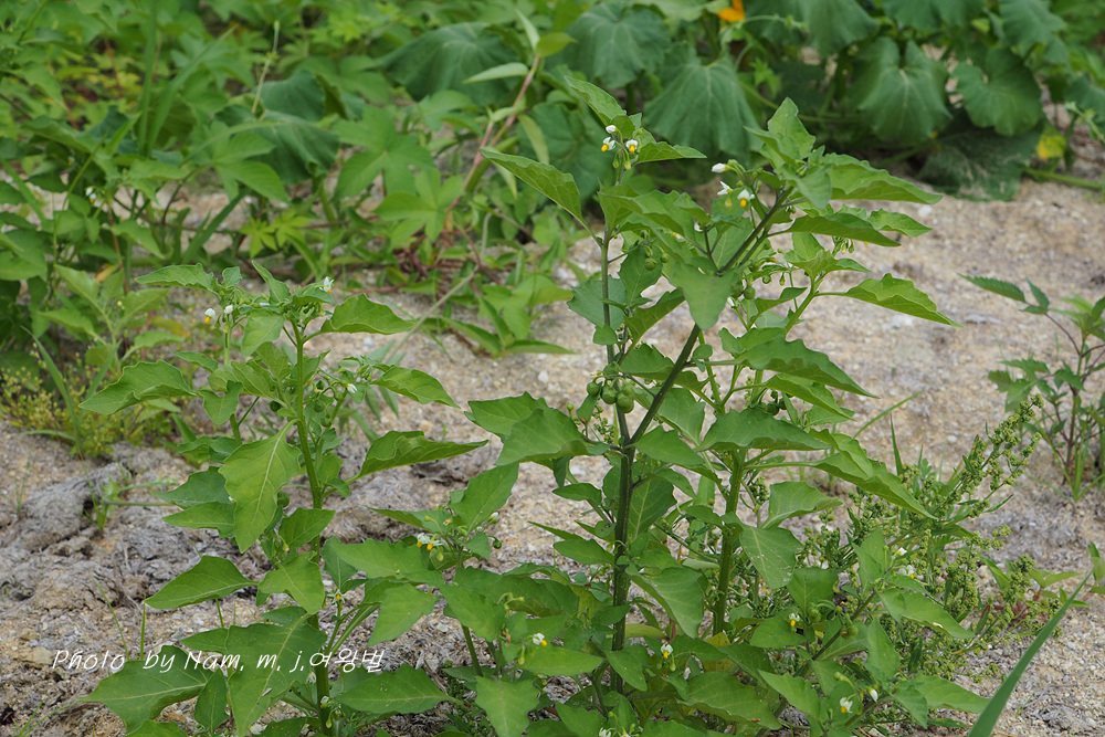 미국까마중에 비하여 꽃이 더 많이 달리고 총상꽃차례이며 열매에 광택이 없다.
