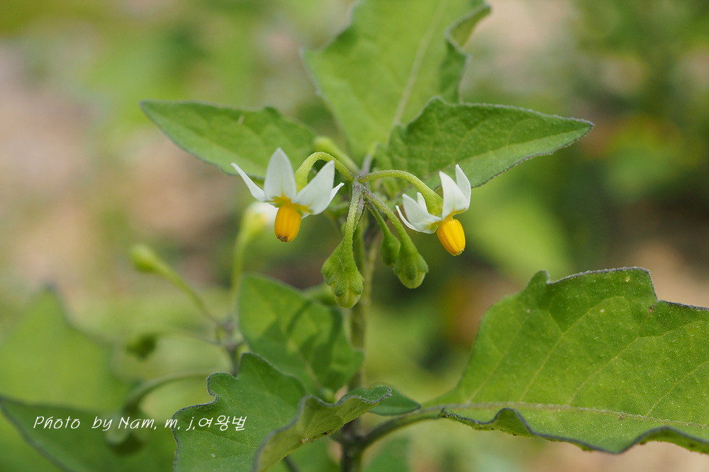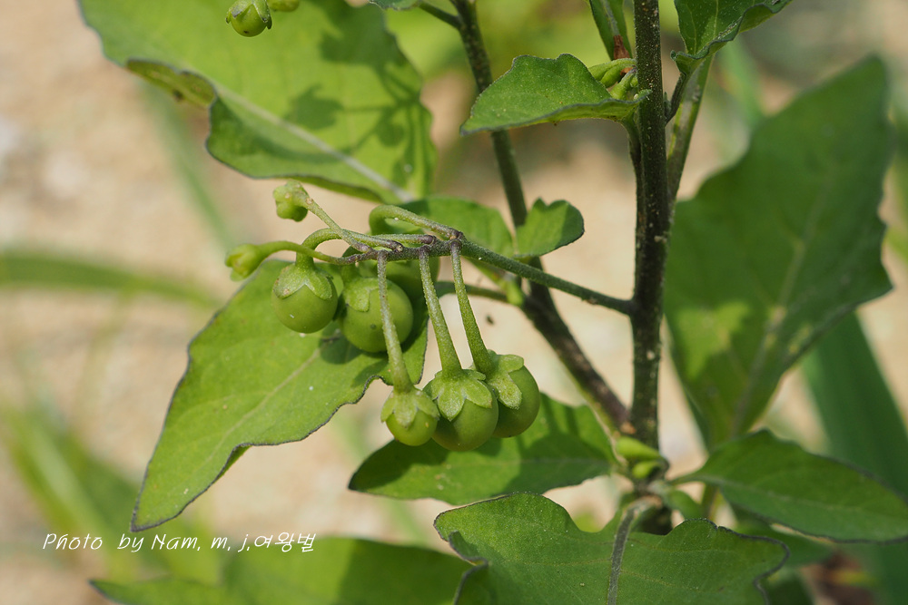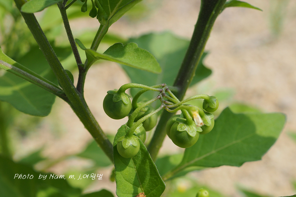 미국까마중 : 산형화서에 2-6개의 꽃이 달리고 꽃받침은 긴타원형으로 흔히 열편 끝이 둔하며 열매에 광택이 있다.