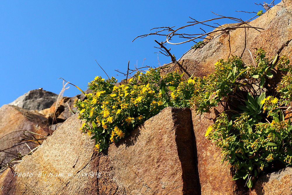 부케처럼 갯바위벽에 무더기로 피어 있는 노란꽃뭉터기 갯고들빼기.