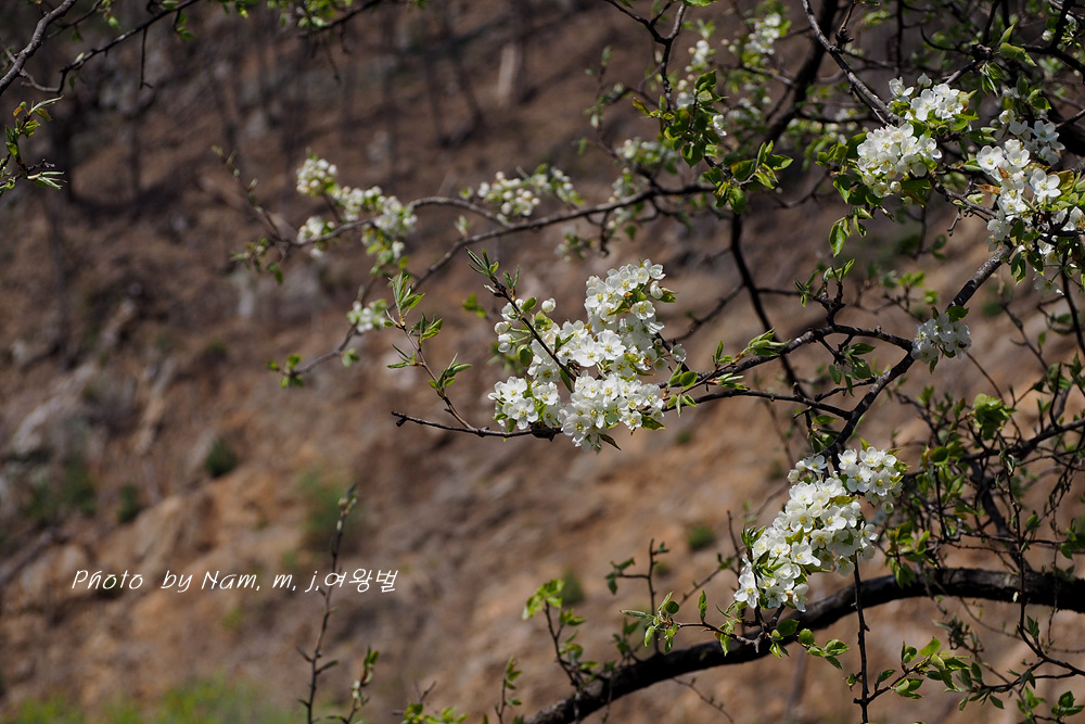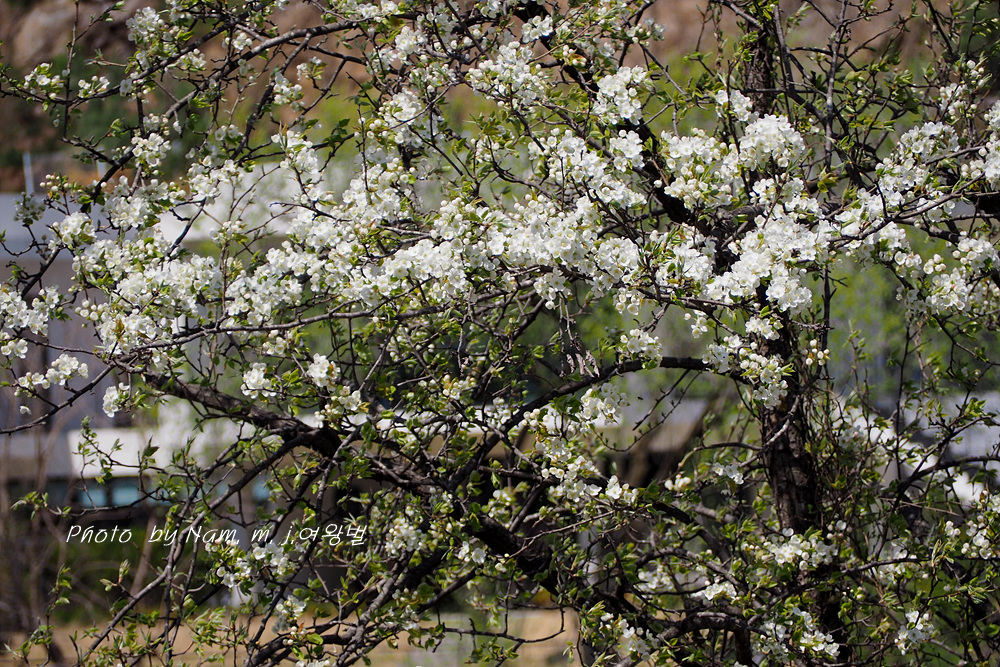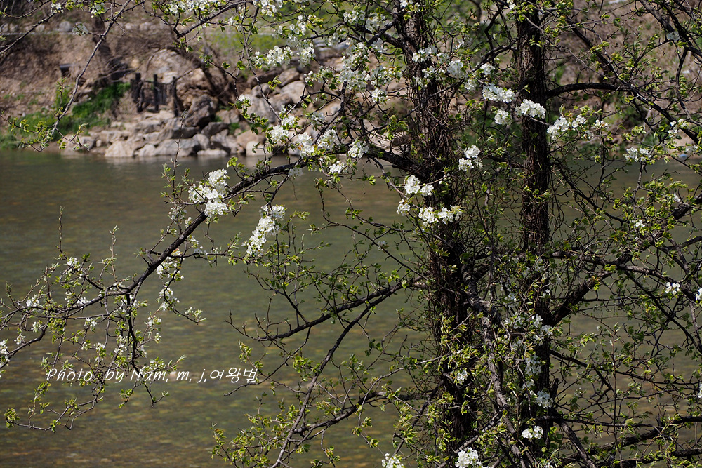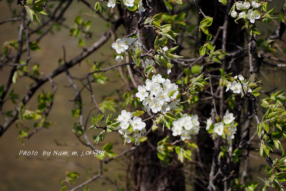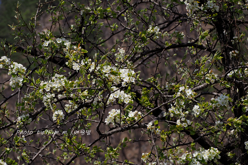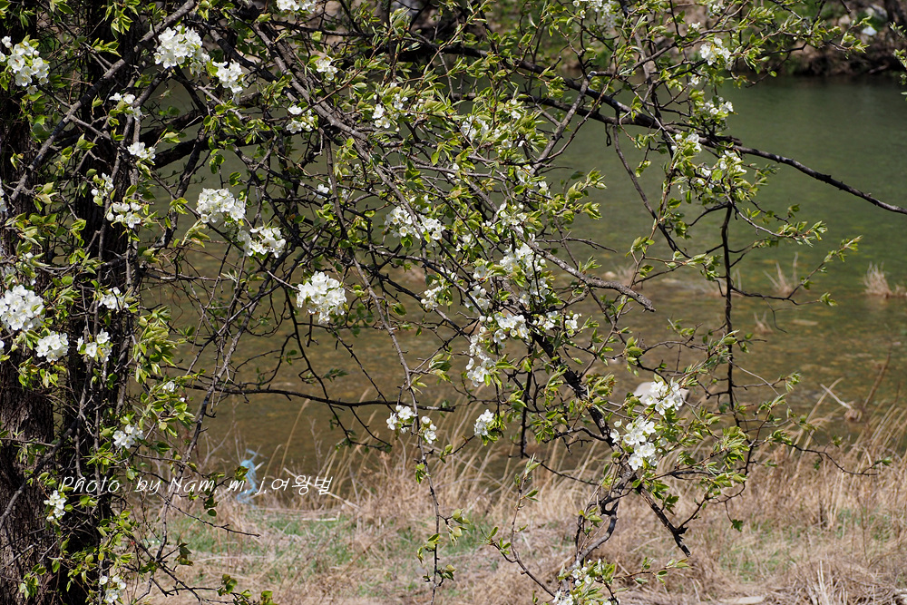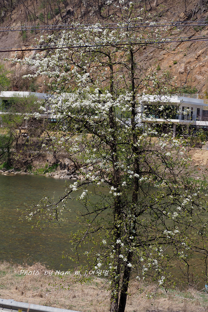 하천 변에 수령이 꽤 되는 배나무속 한 그루에 꽃이 화사하게 피었다.