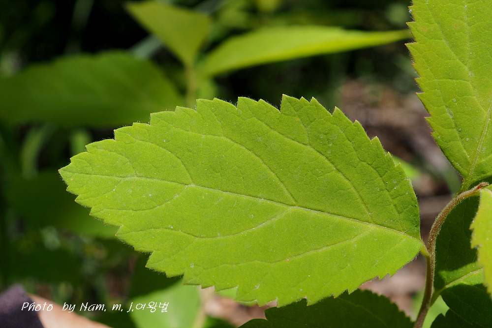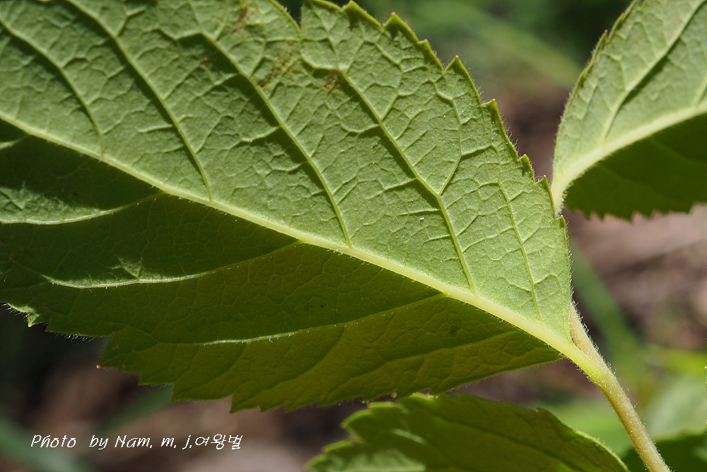 표면에 털이 없으며 표면의 맥이 많이 패여 있고 뒷면은 회록색으로서 맥 위에 털이 있다.