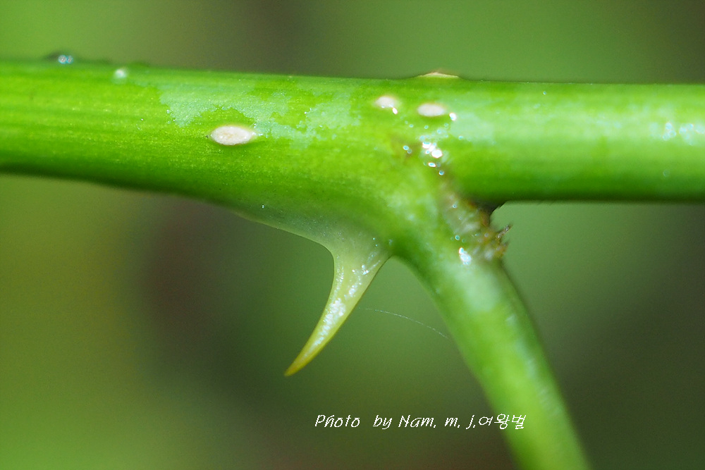 회갈색 줄기의 엽흔 아래에는 4~7mm의 아래쪽으로 굽은 가시가 있다.