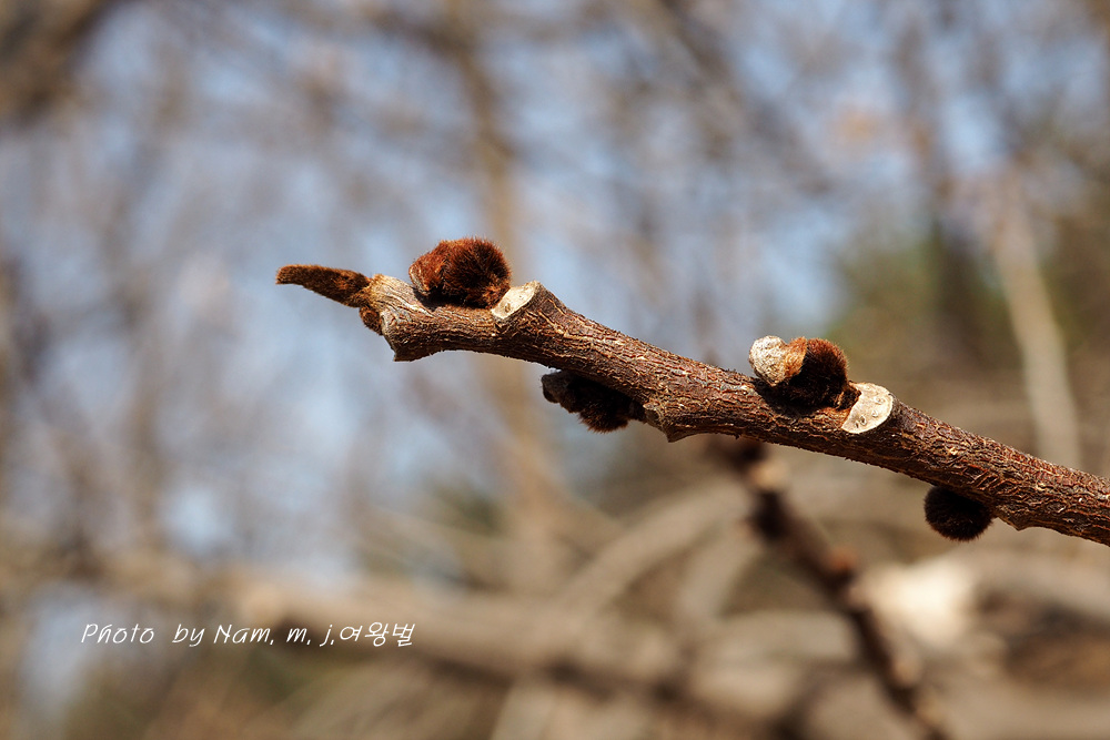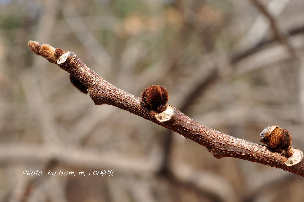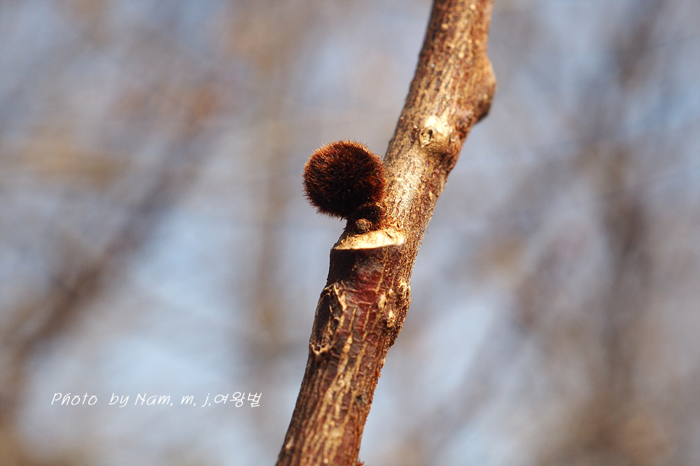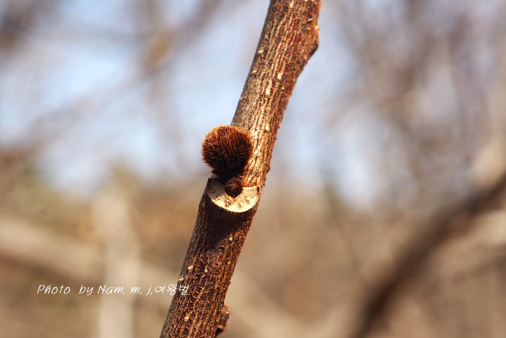자색의 털부숭이 인편을 덮어 쓰고 있는 동그란 꽃눈 동아, 길쭉한 동아는 잎눈이다.