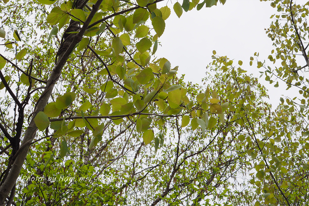나지막한 가지에 붉은겨자색 사시나무 어린 잎이 잔 바람에 떨고 있다.
