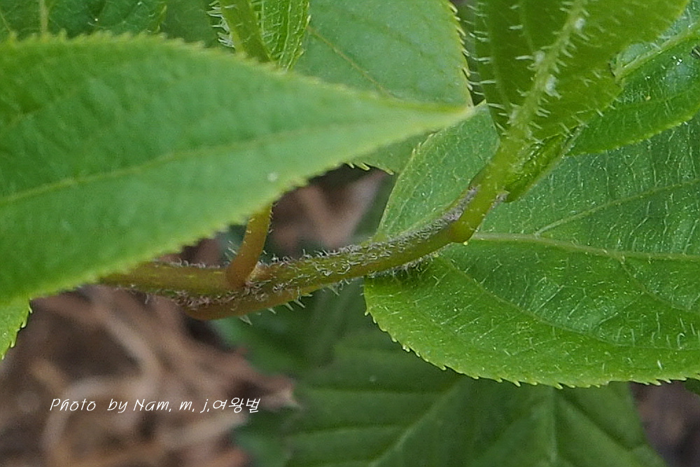 다래 새순 줄기에는 백색털이 있지만 개다래 새순은 쥐다래처럼 까칠한 털이 있다.