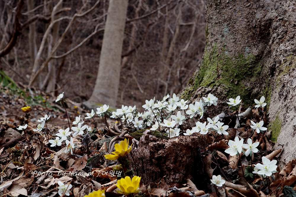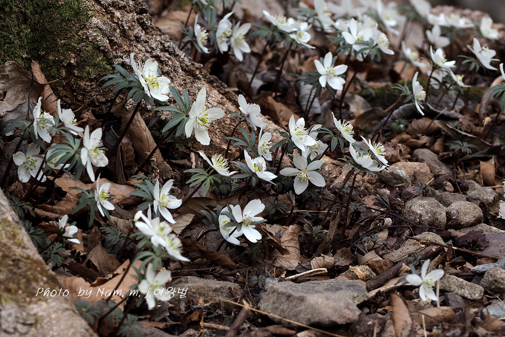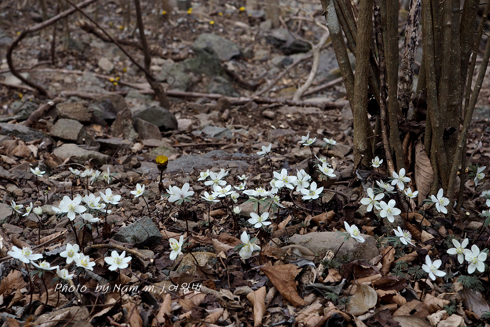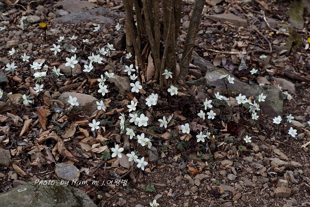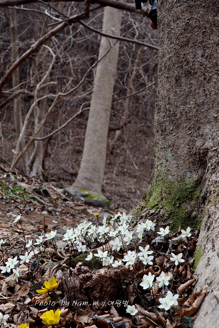 오랜만에 산비탈에 하얗게 하늘거리는 변산바람꽃을 보니 가슴이 설렌다.