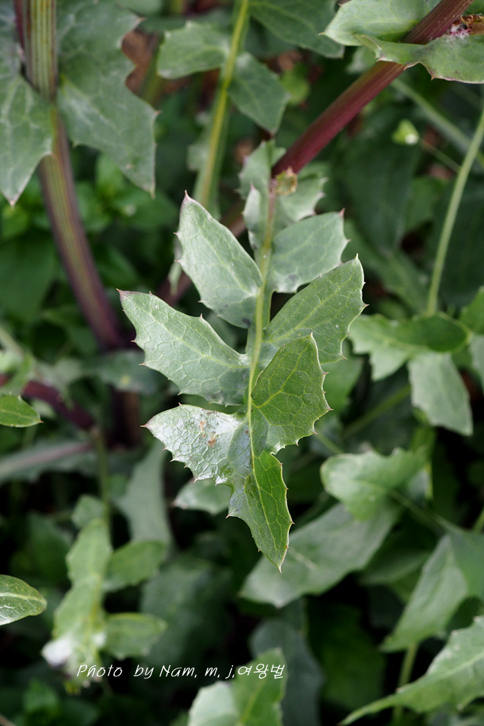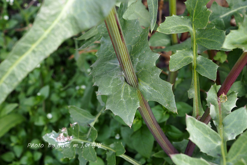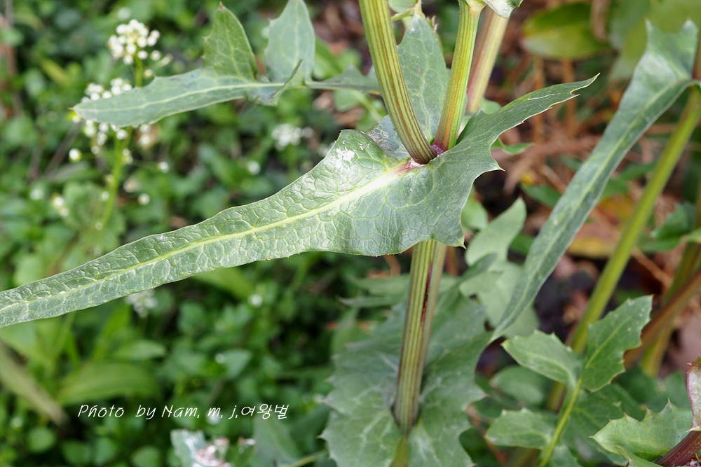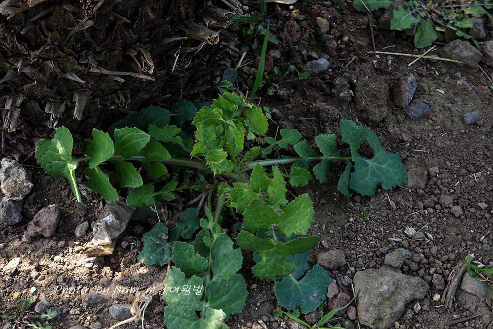 방가지똥 새싹 옆에 큰방가지똥 어린 녀석이 가시를 앙칼지게 달고 방가지똥과 세력을 다투고 있다