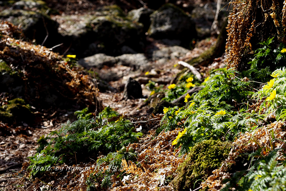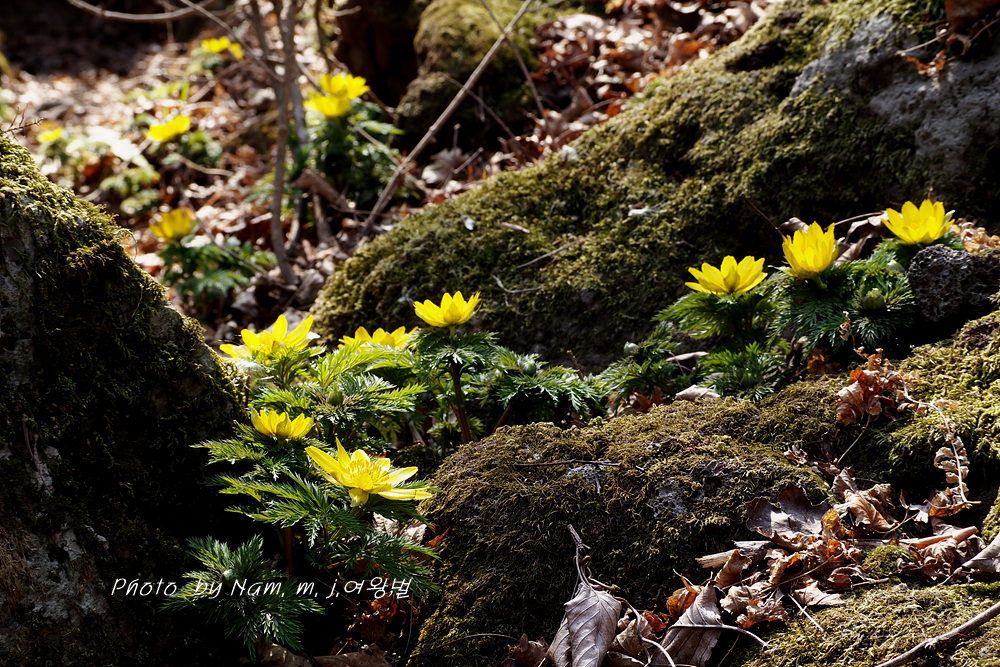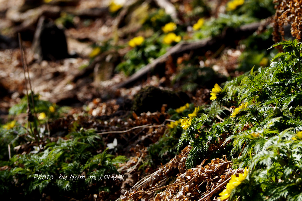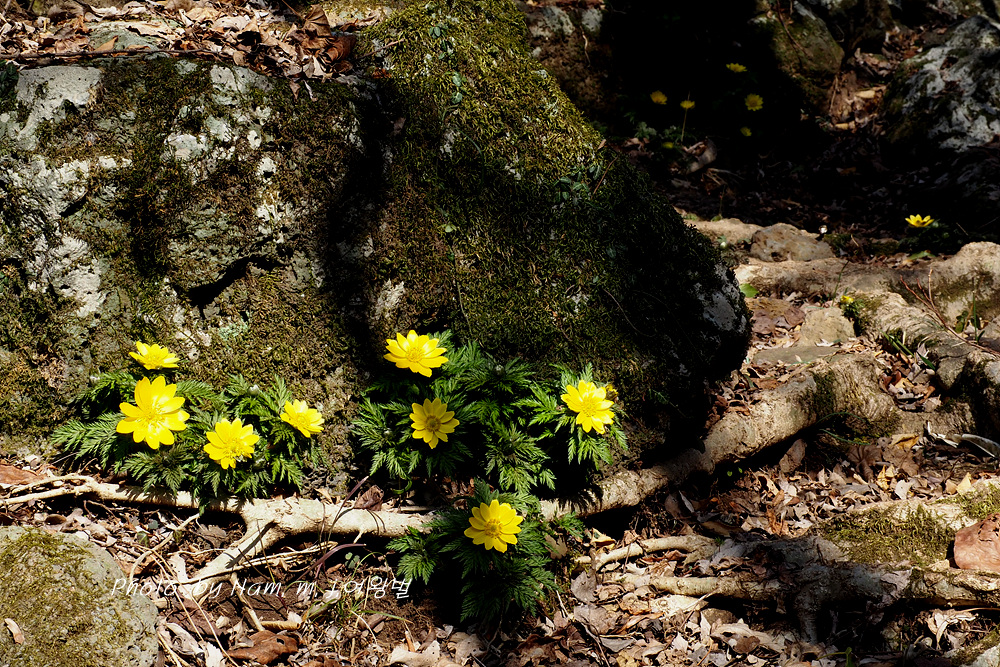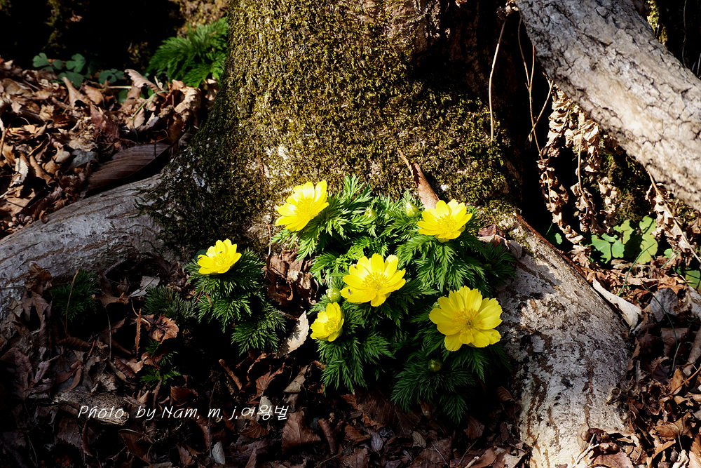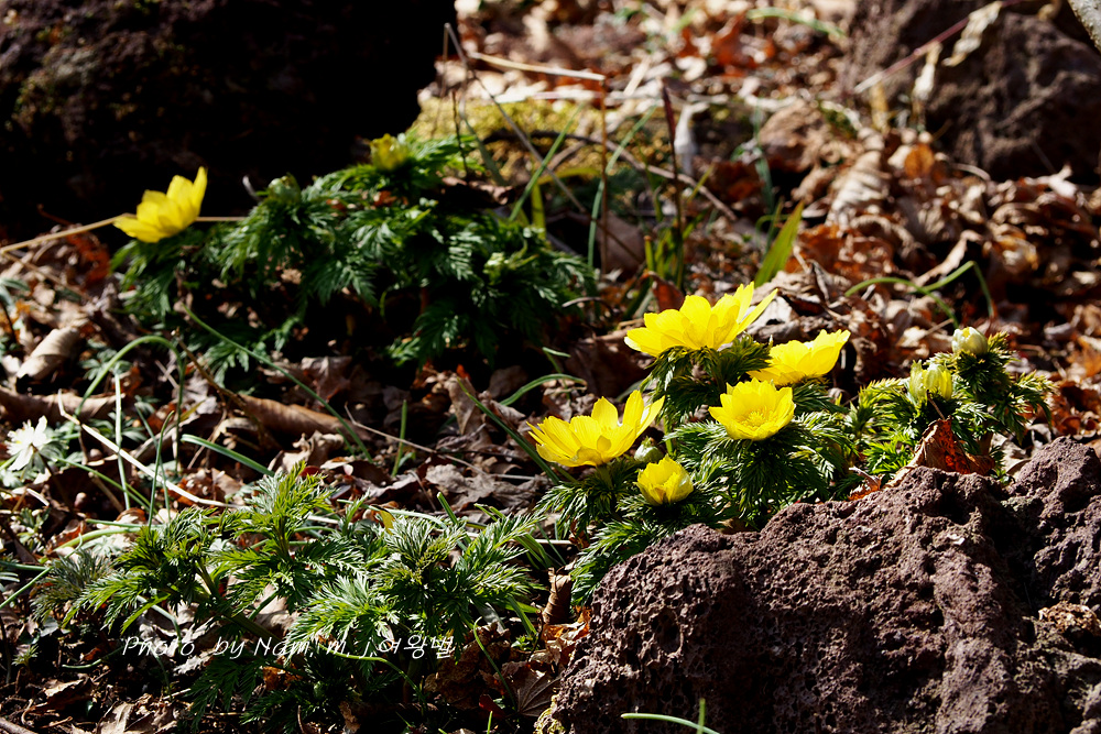 복수초와 달리 꽃이 필 때 잎이 함께 돋아나는 데 잎이 가늘게 갈라지는 점이 특징이다.