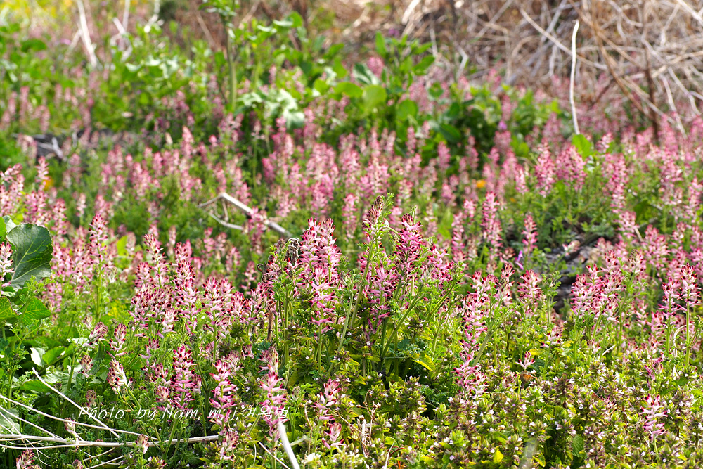 무밭 가장자리 현무암 돌담에 둥근빗살괴불주머니가 완전 도배를 하고 있다.