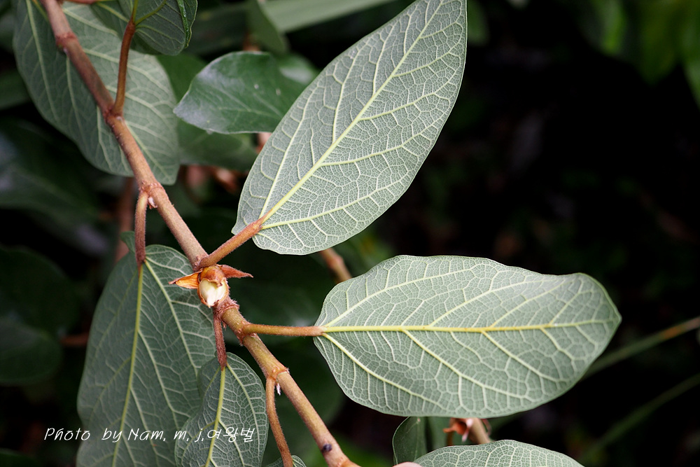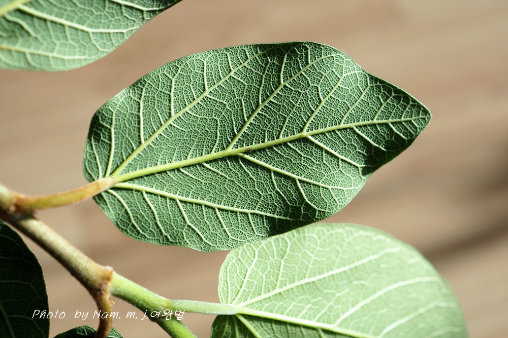 잎은 두텁고 뒷면은 분녹색이며 잎맥이 돌출되어 있다.
