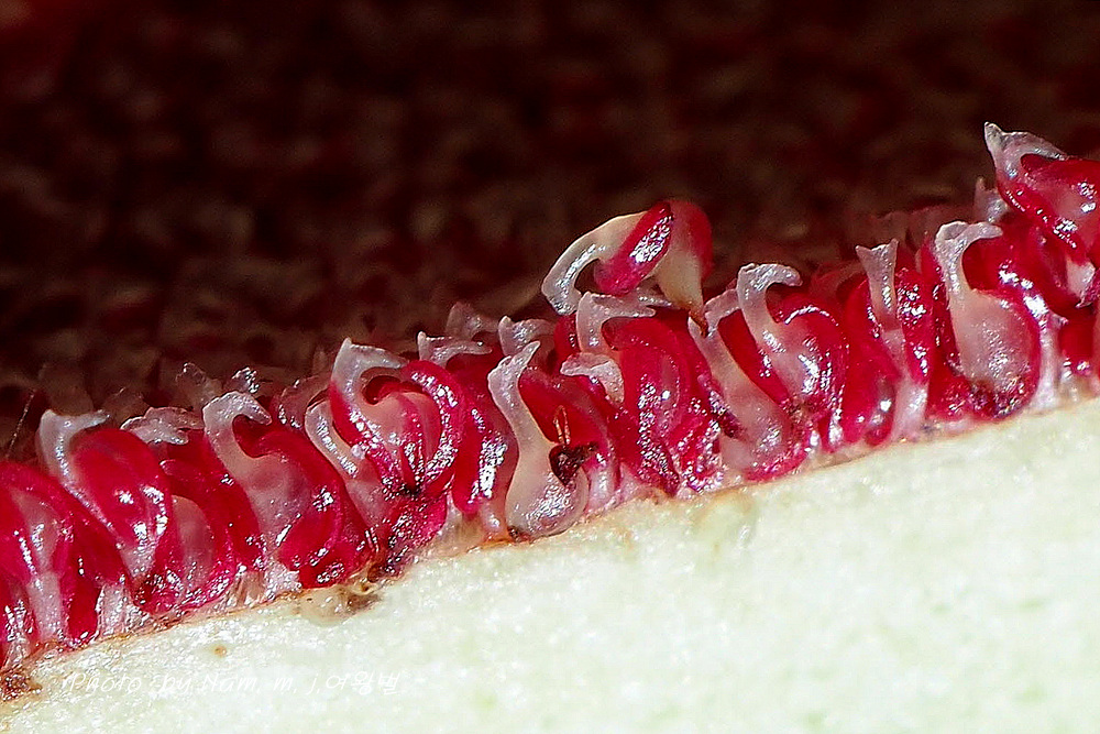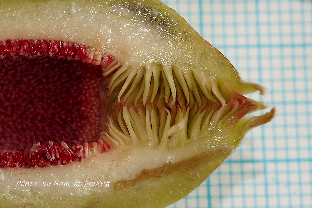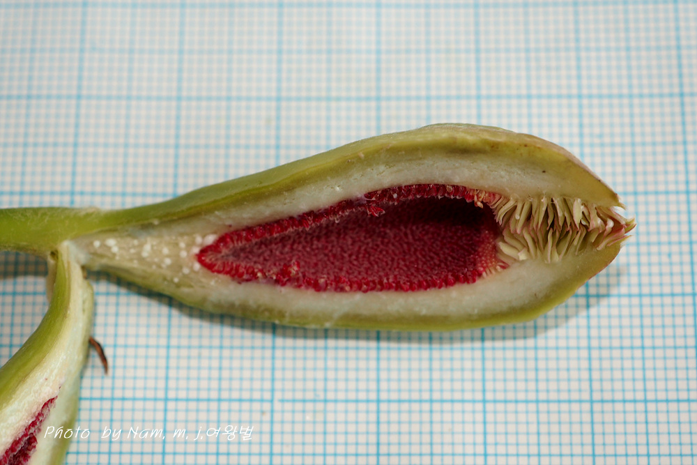 수꽃은 화낭 입구 쪽에 배치되어 있는데 옅은 붉은색을 띠는 수꽃은 구형의 봉오리 아래 짧은 대를 가지고 있다.