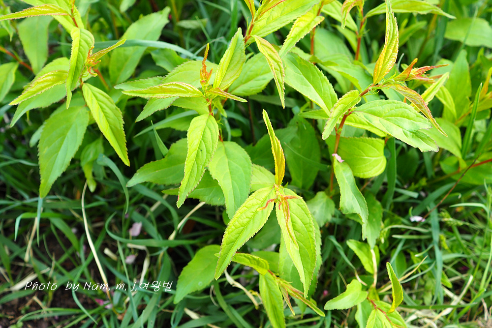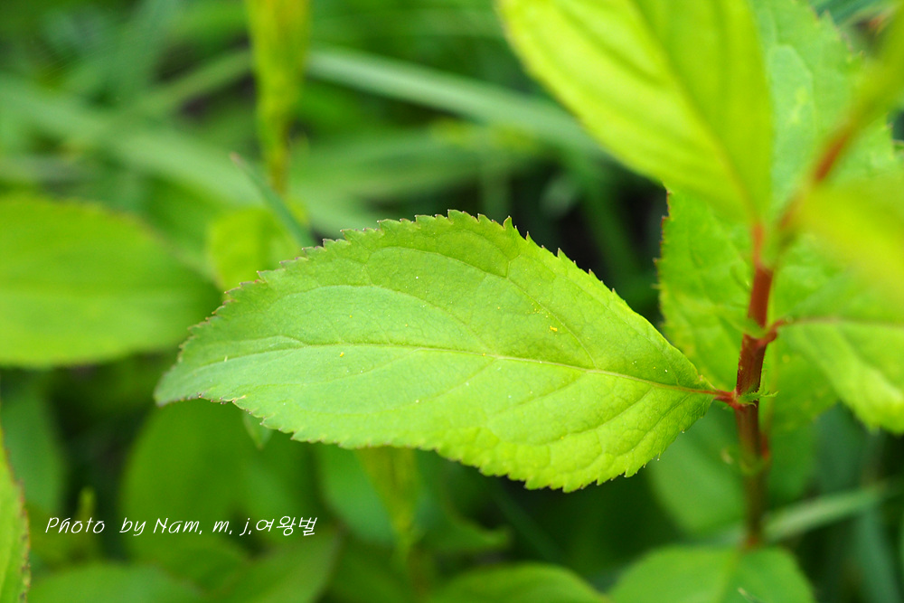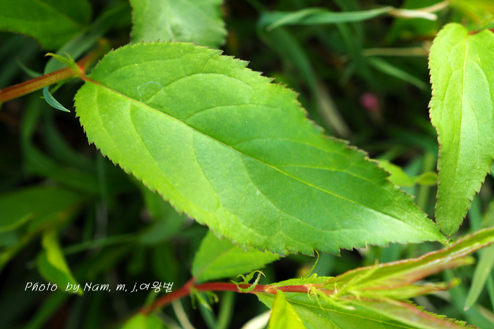 잎은 타원형으로 잎자루가 짧고 불규칙한 자잘한 겹톱니가 있다.